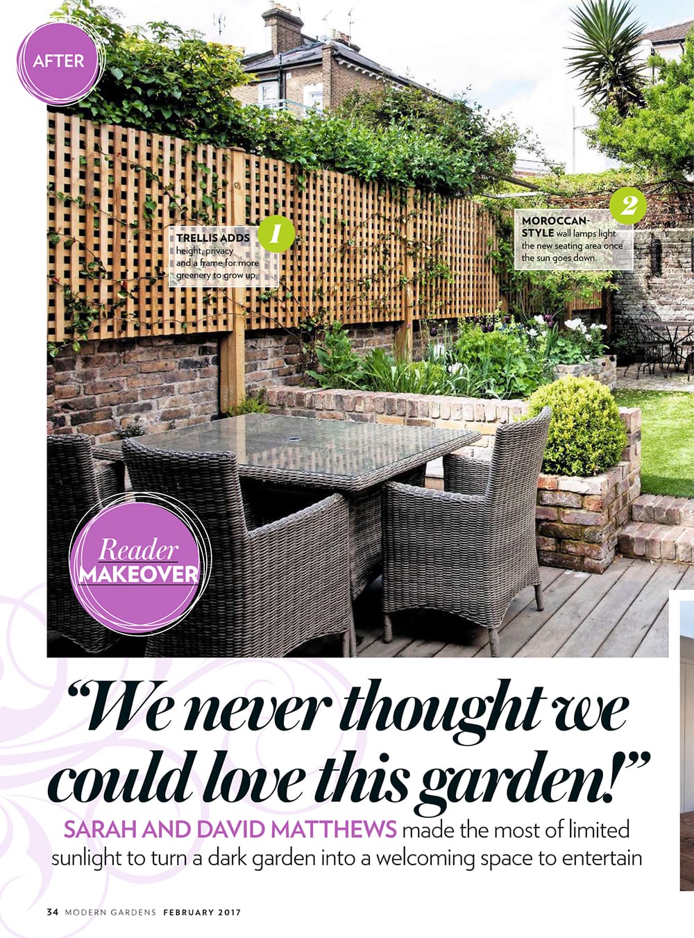 A modern garden inspired by Modern Gardens Magazine features a wooden deck, outdoor dining set, trellis with climbing plants, stone walls, and lush greenery in a small enclosed space—perfect for any garden article.