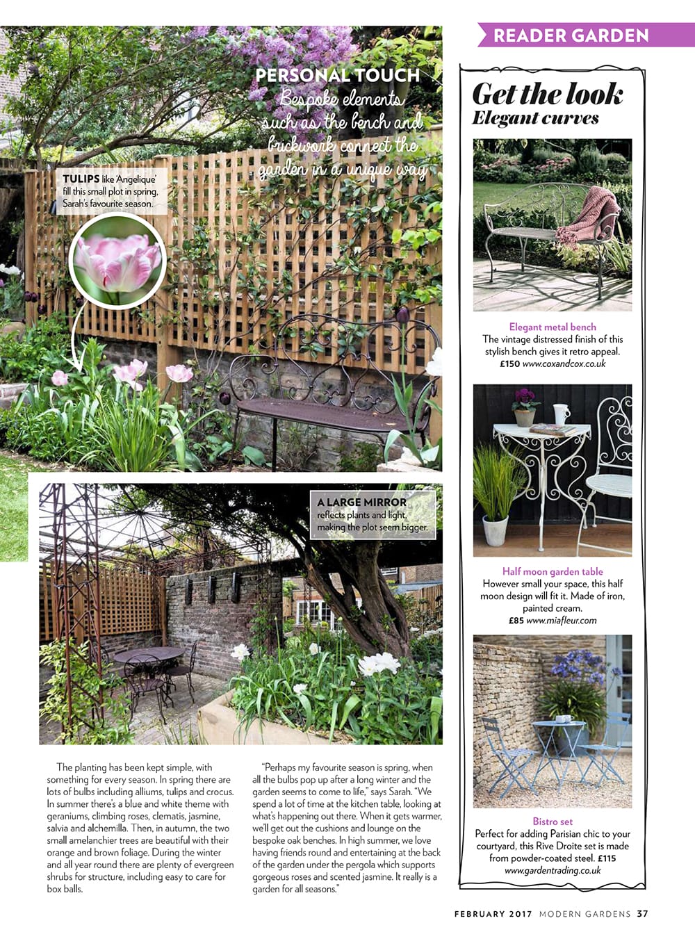 A garden with a wooden trellis, tulips, a large mirror, stone wall, metal bench, round garden table, and lush plants and flowers, as seen in a Modern Gardens Magazine garden article.