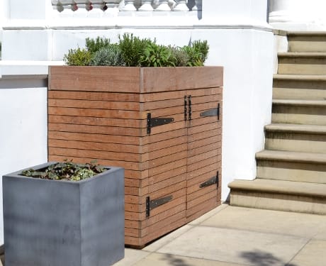 A large wooden outdoor bin storage box with plants growing on top is placed next to steps and a square gray planter.