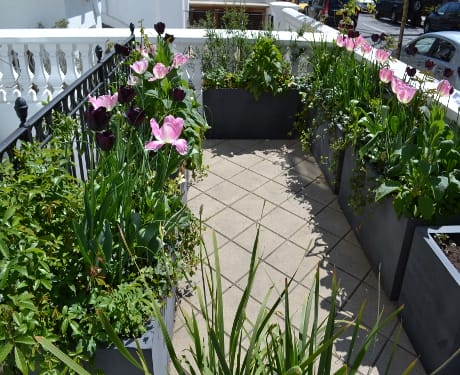 A small balcony garden showcases container gardening with potted plants and flowers, including pink and dark purple tulips, arranged along the railings on a tiled floor.