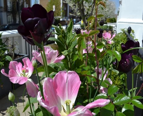 Pink and dark purple tulips in bloom fill a container gardening display beside a sidewalk and residential buildings on a sunny day.