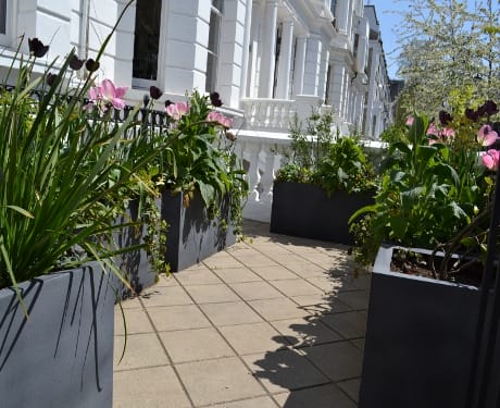 Large square planters filled with green plants and pink flowers showcase charming container gardening along a paved patio outside a row of white residential buildings.