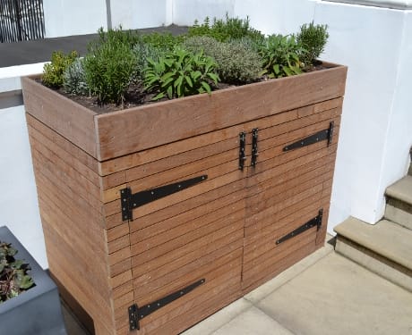A wooden planter box ideal for container gardening, with herbs thriving on top, featuring double doors and black metal hinges, placed beside outdoor steps.
