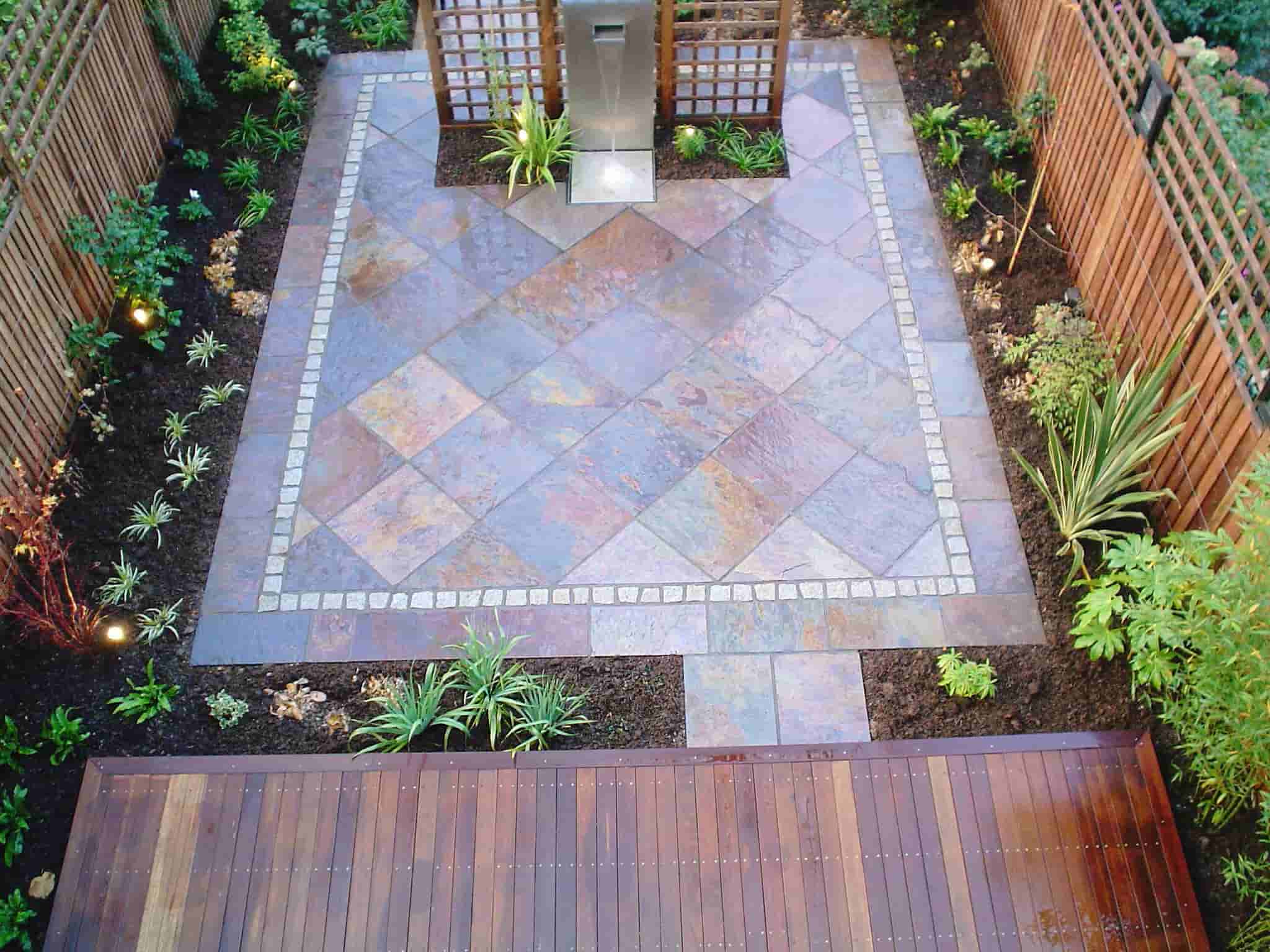 A small, fenced backyard garden with a central square patio of slate tiles and steel accents, surrounded by planting beds and wooden decking in the foreground.