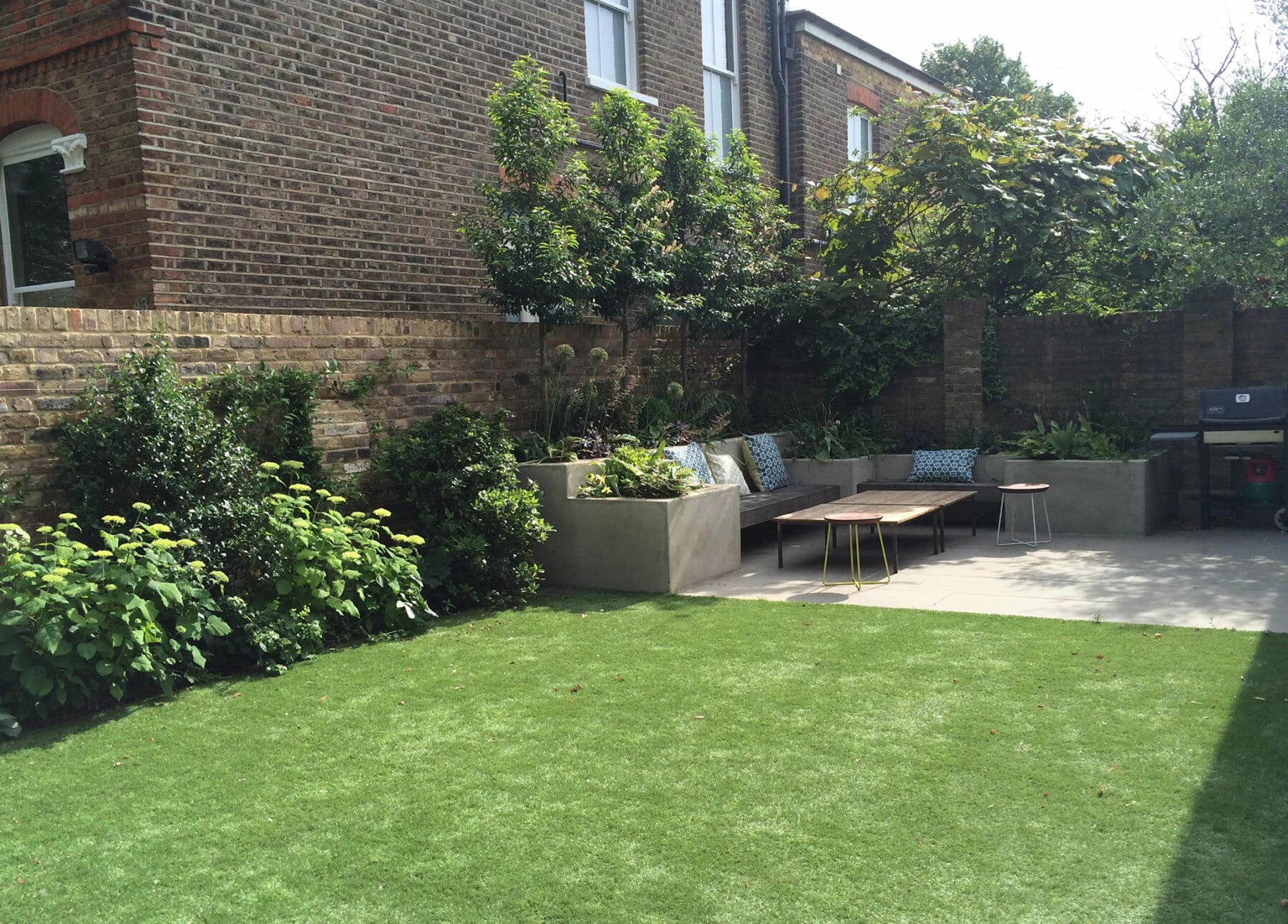 A symmetrical backyard features artificial grass, concrete planters, benches with cushions, a small table, and mature greenery set against a classic brick wall.