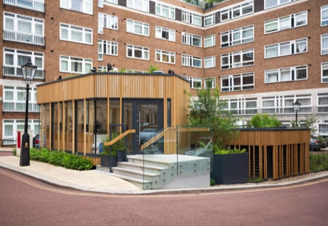 A contemporary building with glass walls and wooden slats is attached to a multi-story brick apartment complex, featuring a glass-railed staircase and landscaped plants around the entrance.
