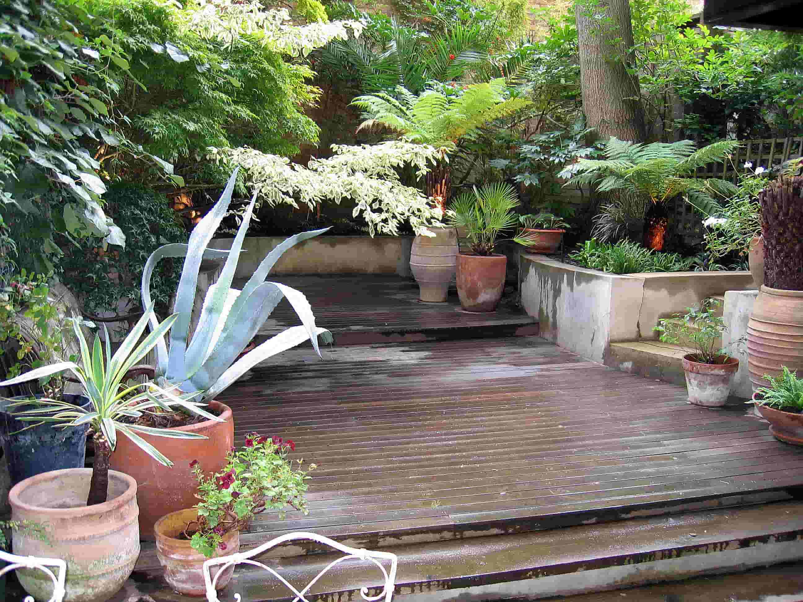 Wooden patio deck with various potted plants and greenery, surrounded by ferns, agave, and leafy shrubs in a shaded garden area that evokes an Eastern Exotic ambiance.