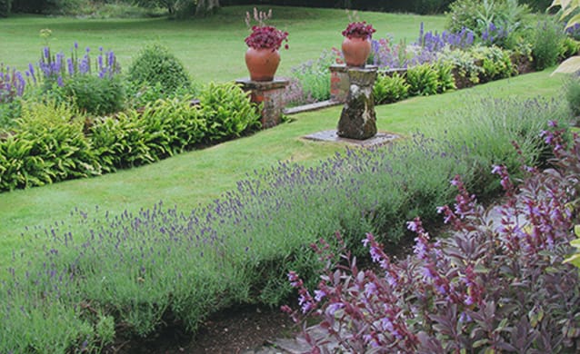 A well-maintained garden with trimmed grass, purple flowering plants, and two large terracotta pots with red flowers on stone pillars creates an Eastern Exotic ambiance.