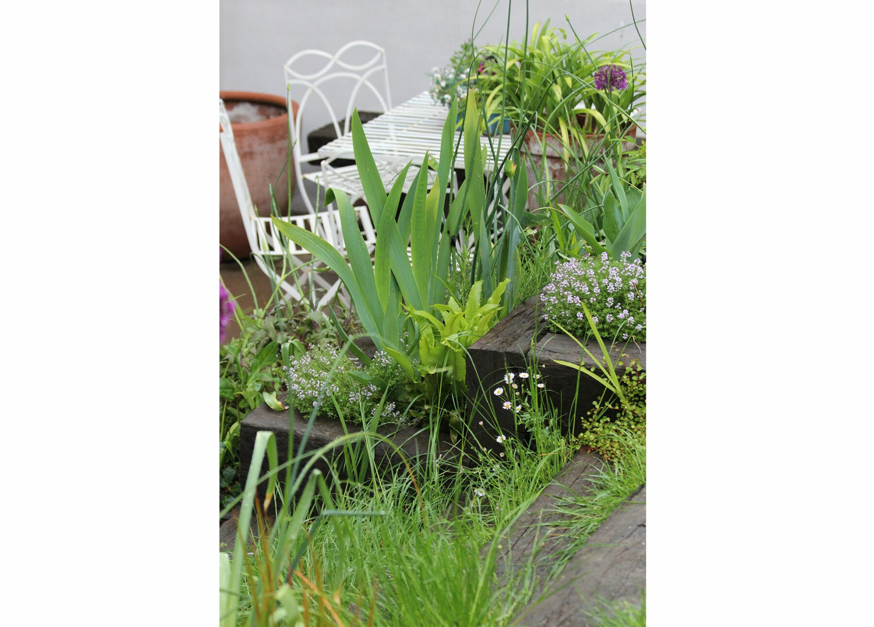 White metal chairs and a table are set up in a chillout garden with tall green plants, small flowers, and grass growing around stone steps.