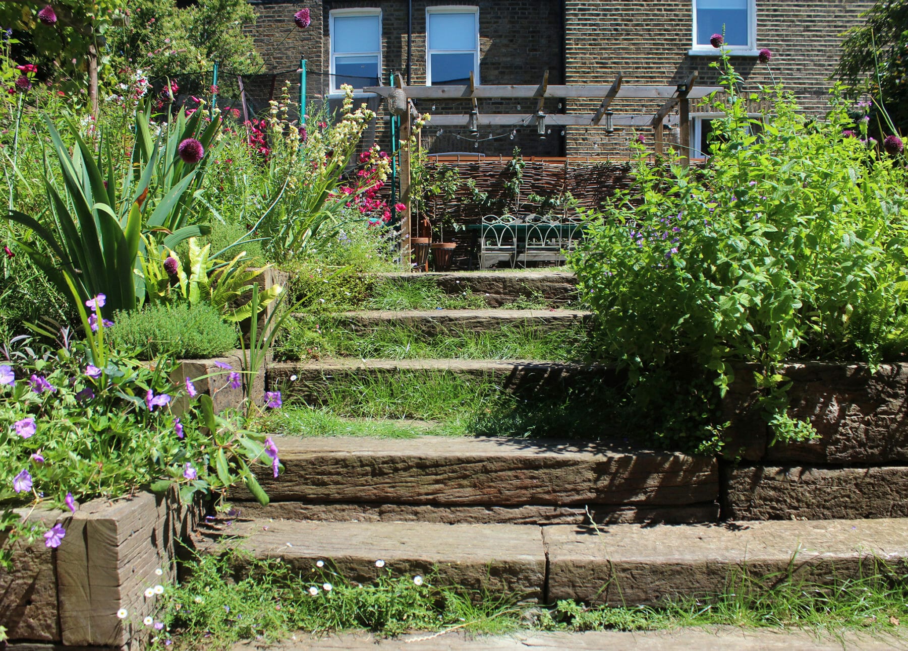 Stone steps wind through a lush chillout garden filled with green plants and flowers, guiding you toward a wooden pergola and a metal bench set before a charming brick building.