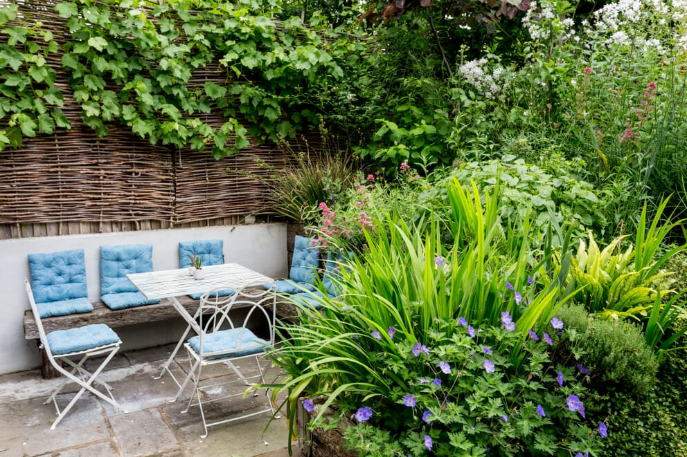 A small outdoor chillout garden seating area with a white table and metal chairs with blue cushions, surrounded by lush green plants and flowers.