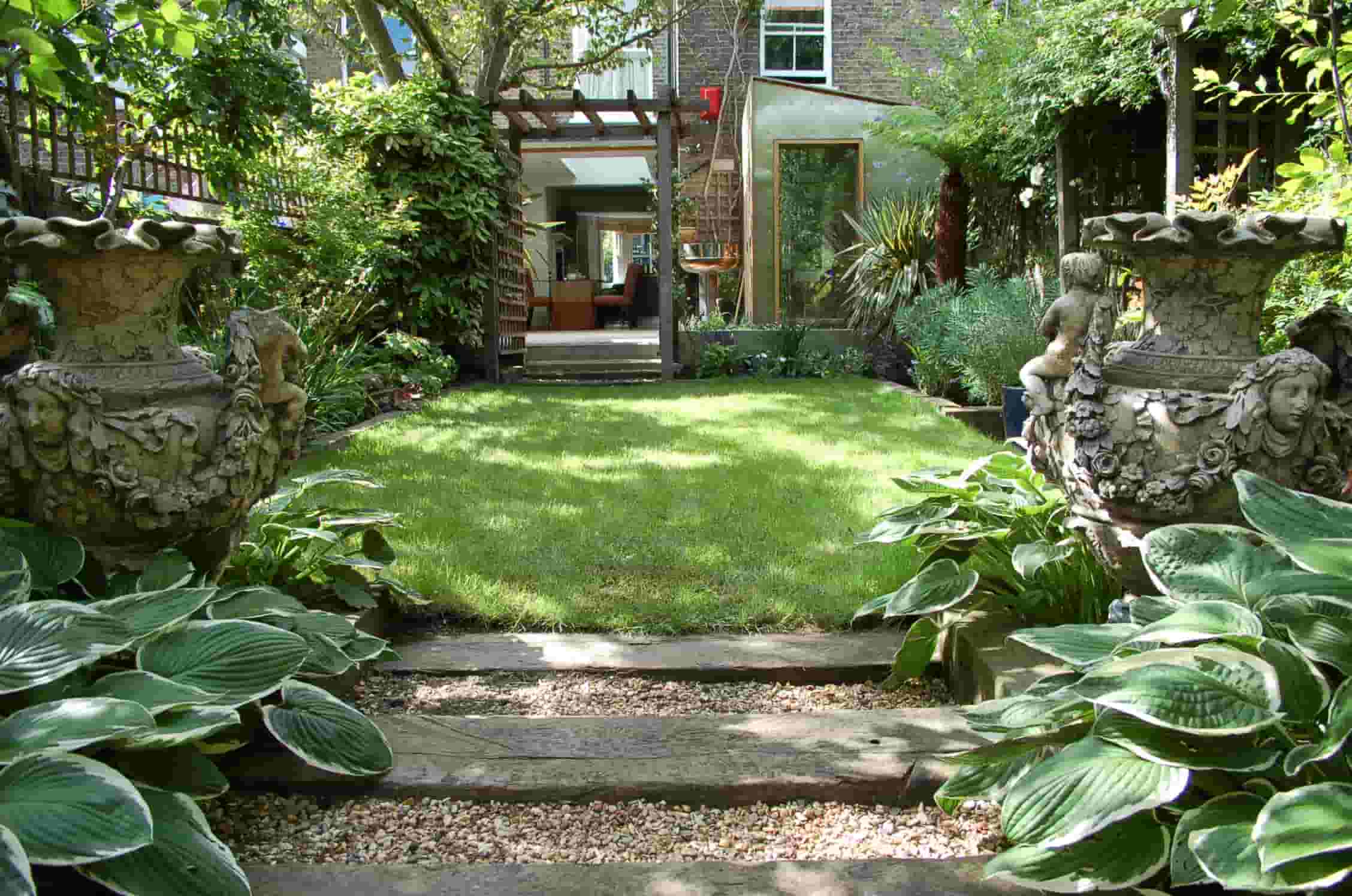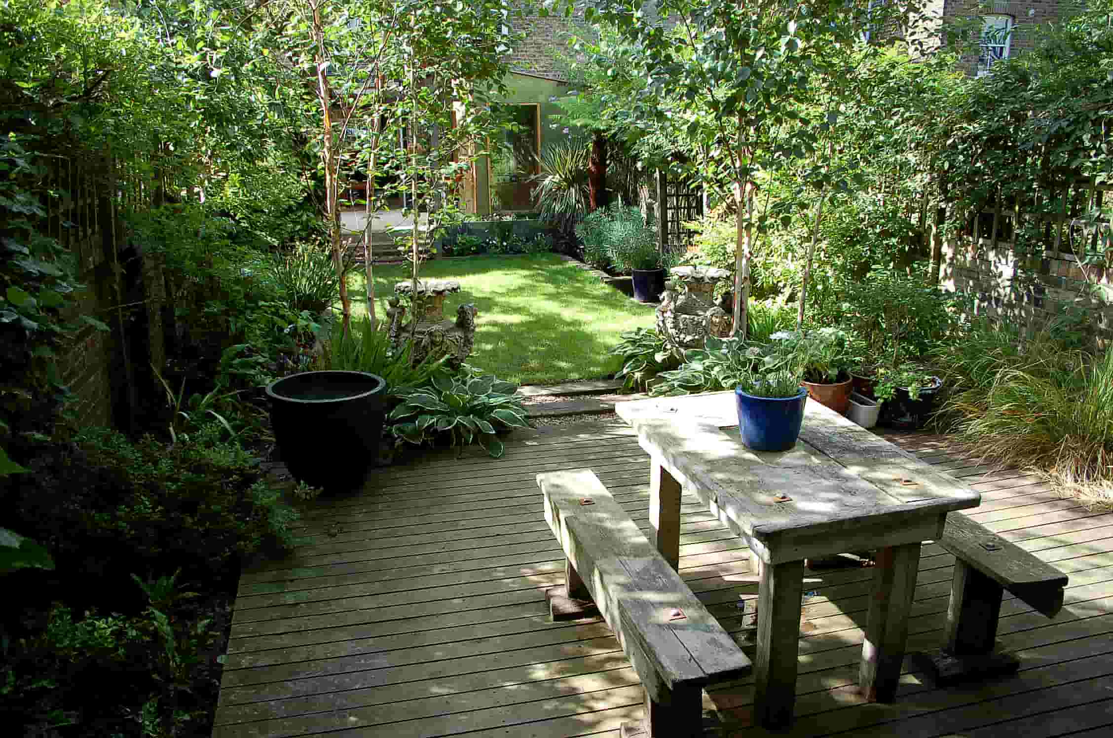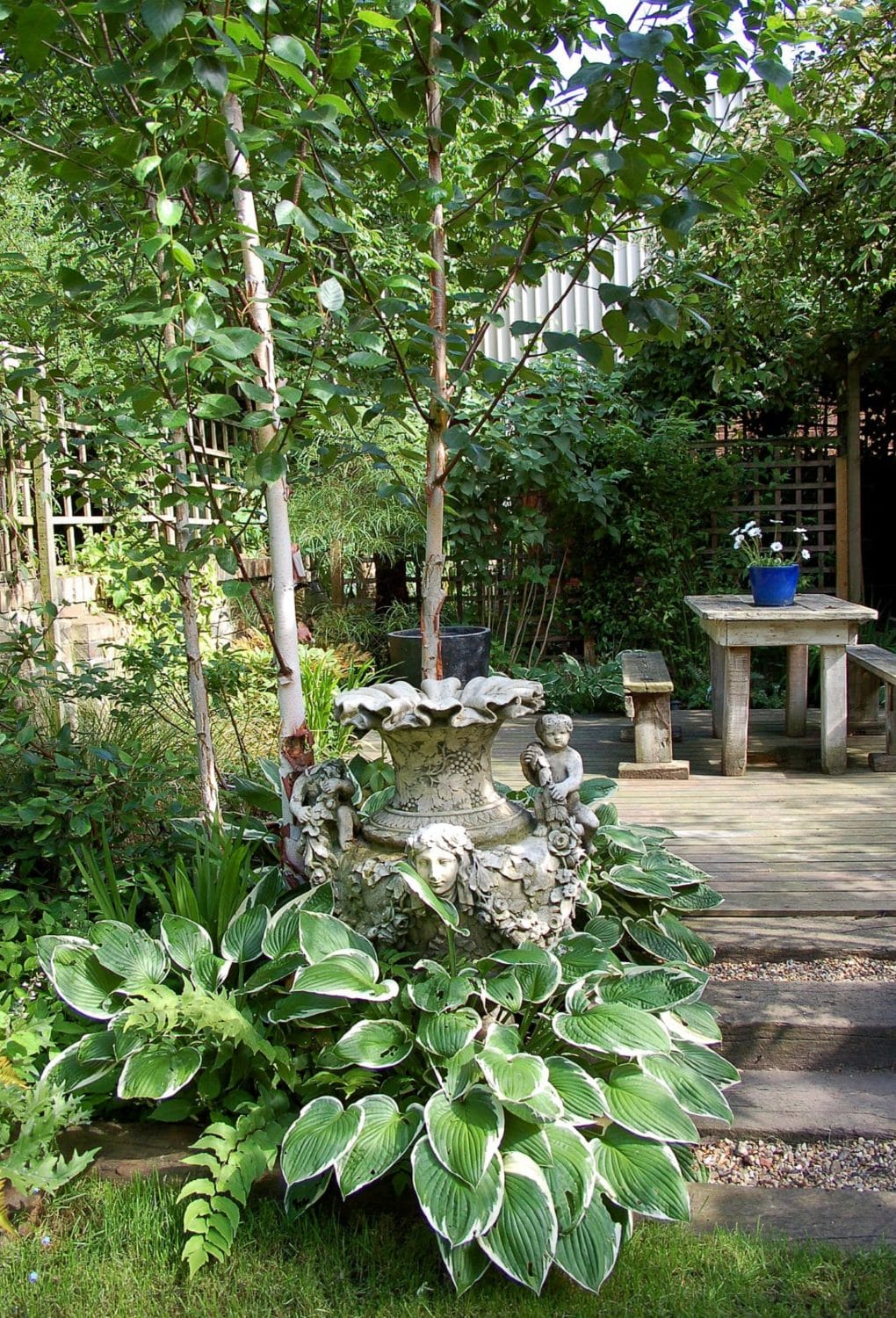 This garden consists of three separate sections: a patio area near the house with a portable BBQ and an archway leading to the lawn area with planting at the side. The third section is the main feature of the garden – the rear decked patio set amongst a light woodland. This area can be approached from the lawn through a gravel path with timber sleepers acting as stepping stones, and two ornamental urns acting as piers with two Himalayan birch groups. The bespoke timber archway frames the view of the rear garden making it an even more inviting space.