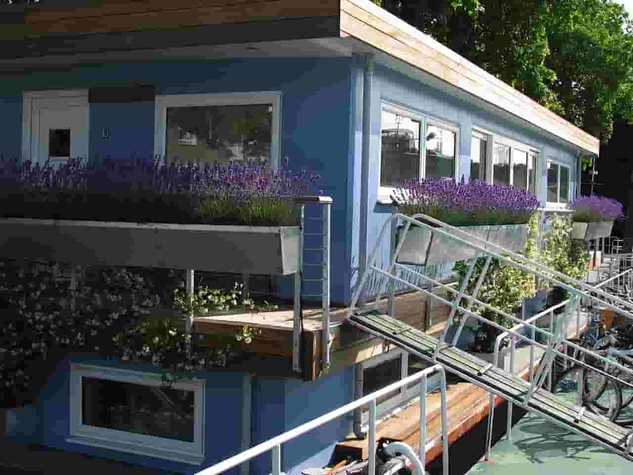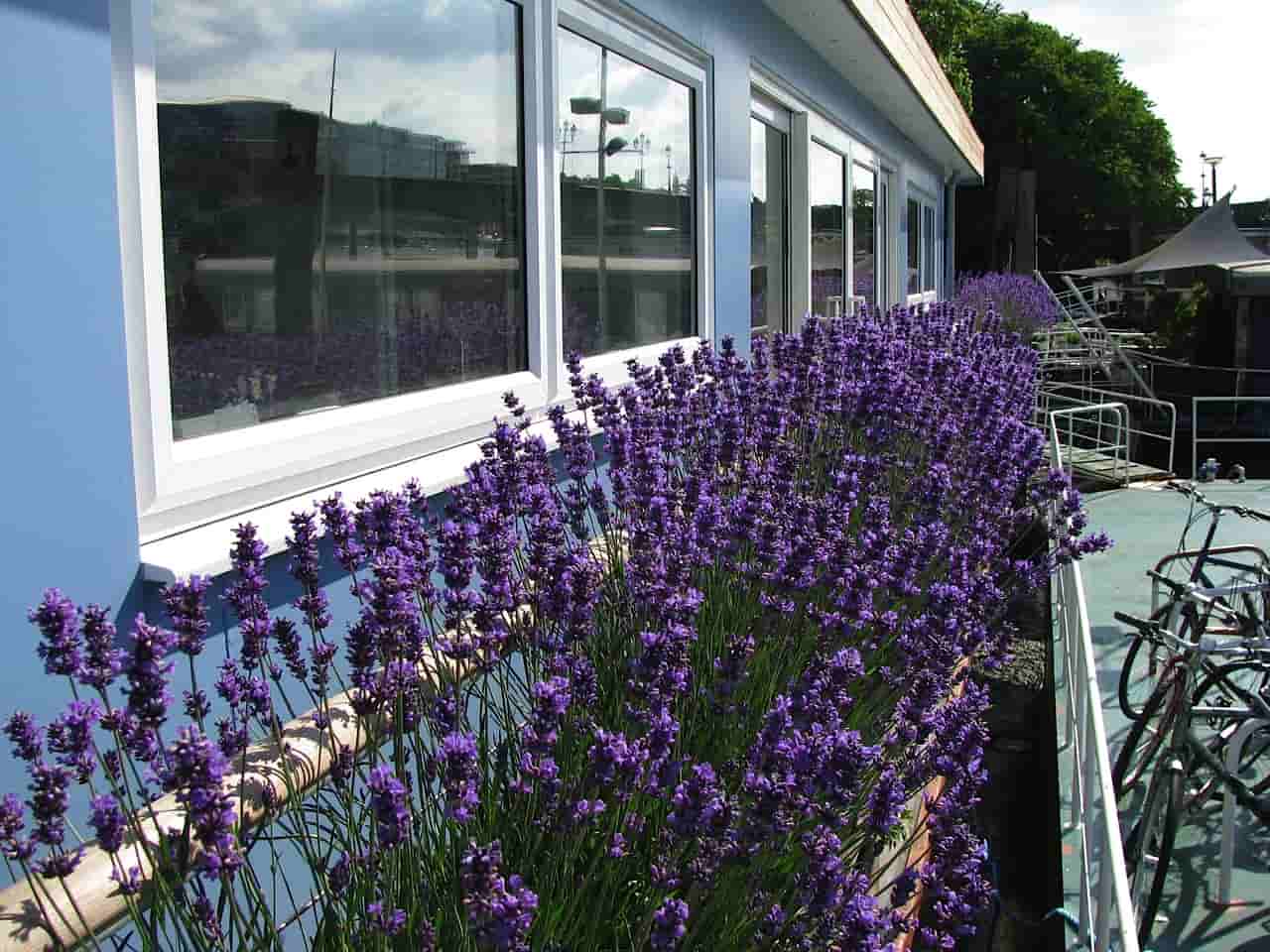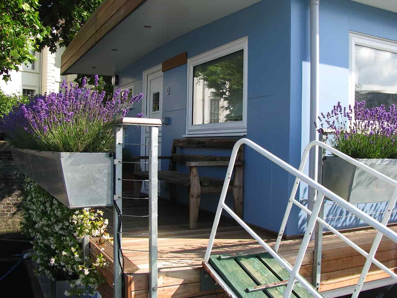 This houseboat moored in Chelsea is enhanced with plants in galvanised metal planters. Privacy is an issue, as most people are curious about these boats docking in the shores of the Thames: the tall lavender hedge helps to part-cover the windows but still lets in light. The shadier parts are planted with evergreen climbing jasmine (Trachelospermum jasminoides), which also help to cover part of the blue wall and give a lovely scent to the air when the white flowers are in bloom. The riverside setting combines well with the Mediterranean planting theme to give a truly continental impression.
