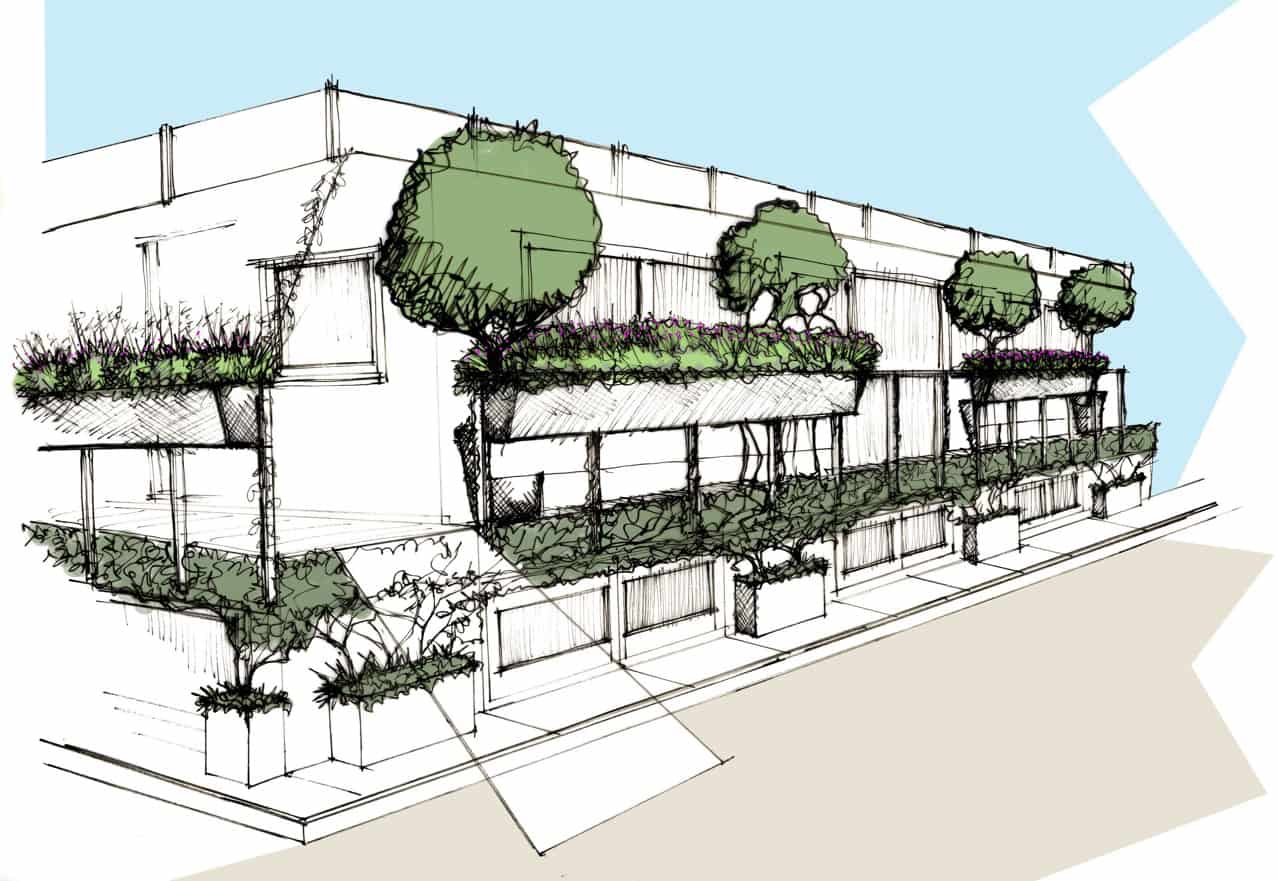 Architectural sketch of a modern building inspired by houseboat design, featuring large rectangular windows, rooftop greenery, balcony planters, and potted plants along the sidewalk.