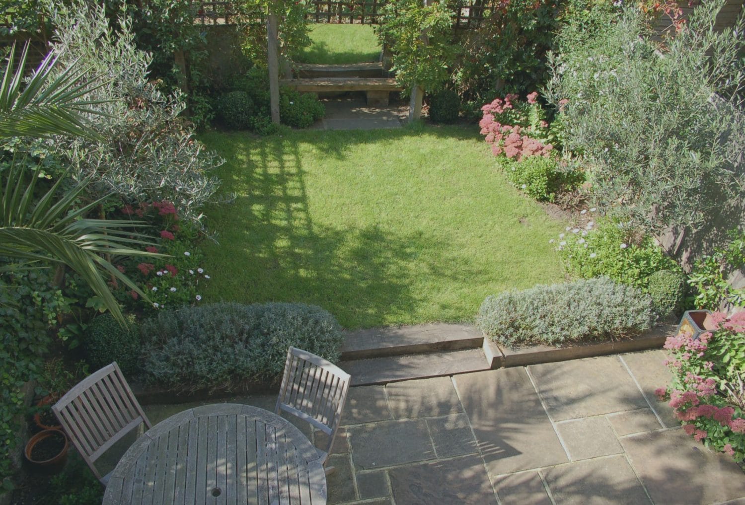 View of a small, neatly maintained oval garden with a lawn, surrounding flower beds, a wooden bench at the back, and a stone patio with a round table and chairs in the foreground.