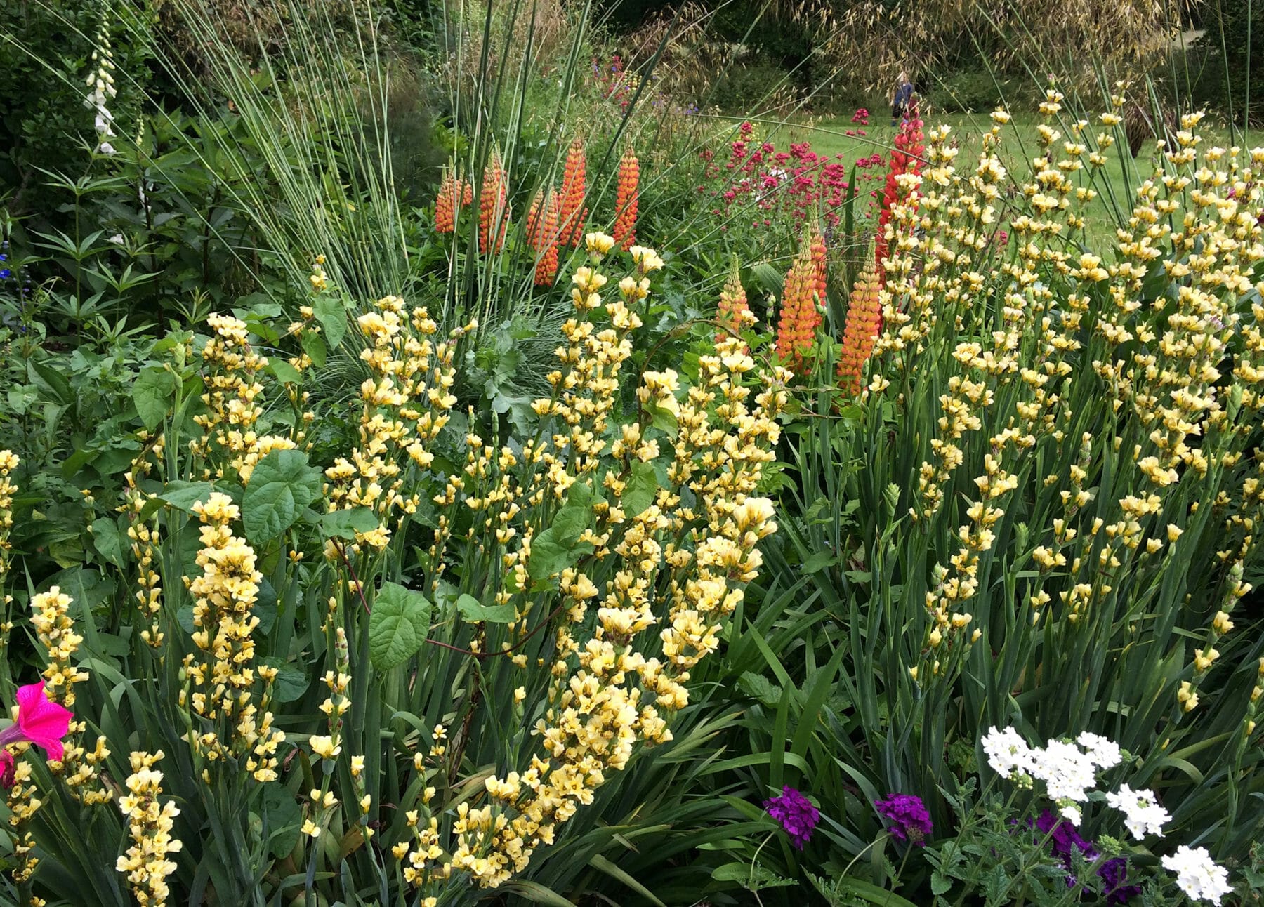 A garden bed with clusters of yellow, red, orange, white, and purple flowers set among green foliage evokes the charm of a Secret Garden in the Chilterns.