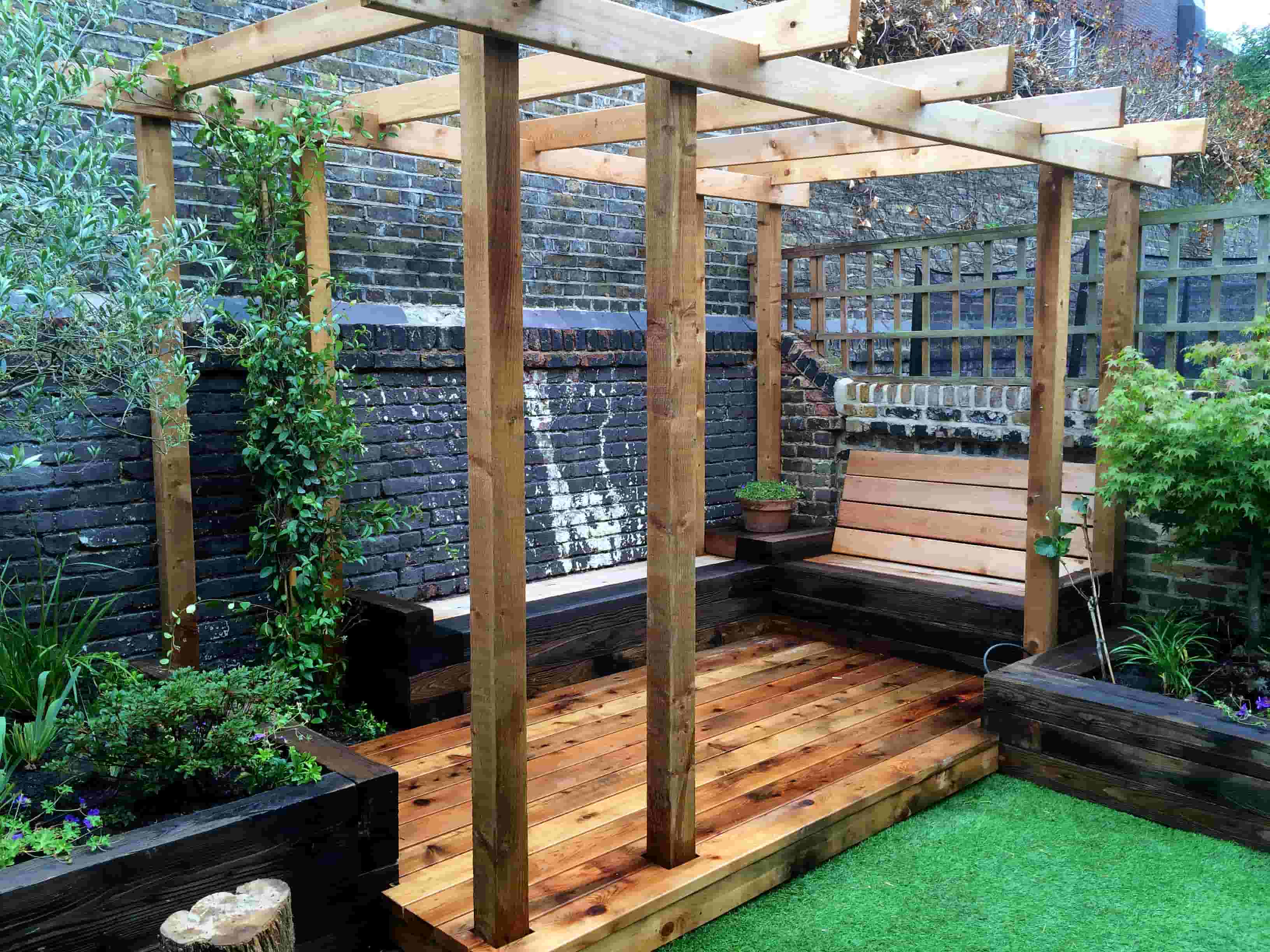 Bespoke garden pergola with benches and planters in a small fenced space, featuring green artificial grass and climbing plants against brick walls.