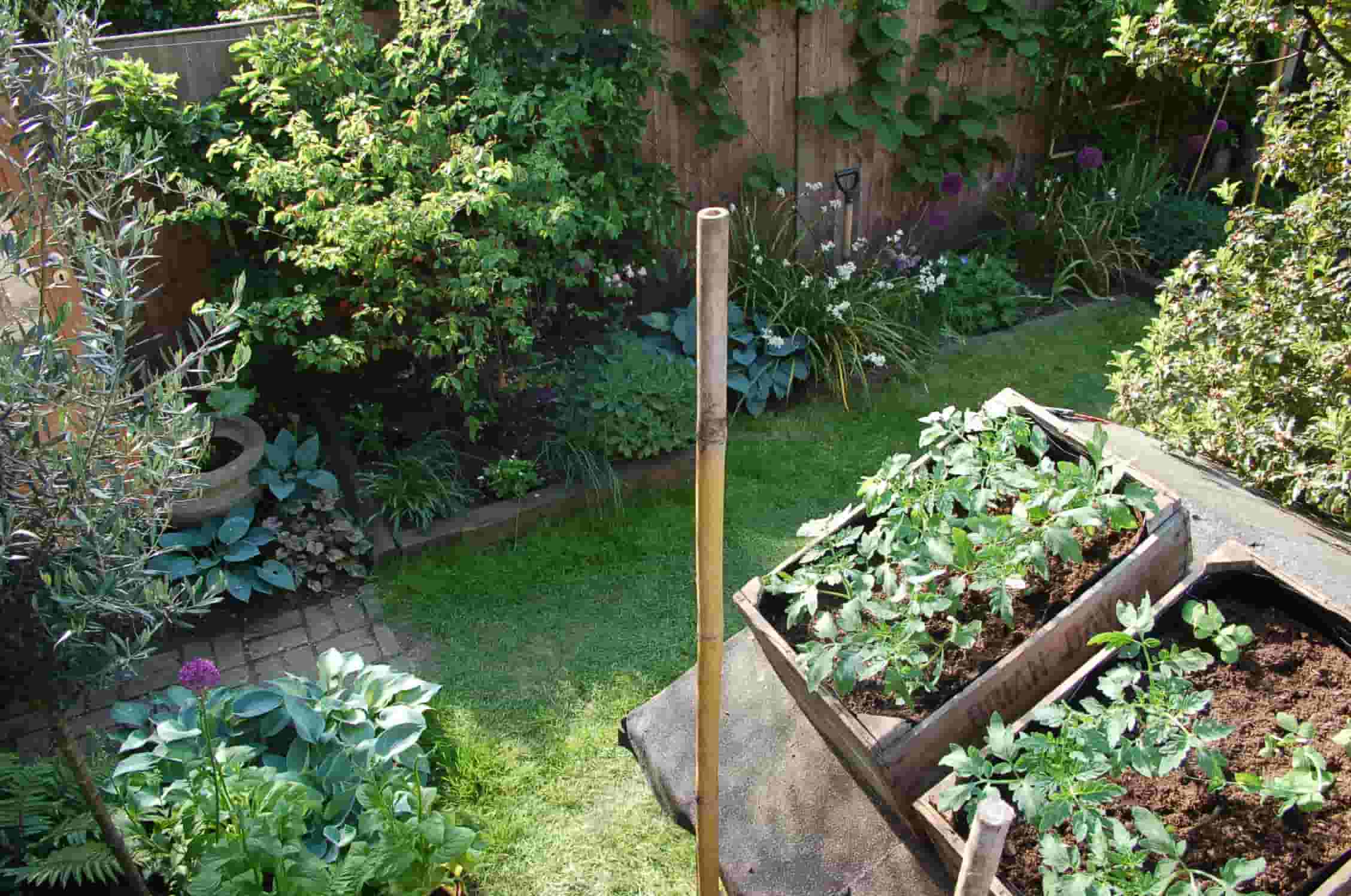 Small backyard Edible Garden with raised beds containing leafy plants, surrounded by various shrubs and greenery, and a wooden stick in the center.