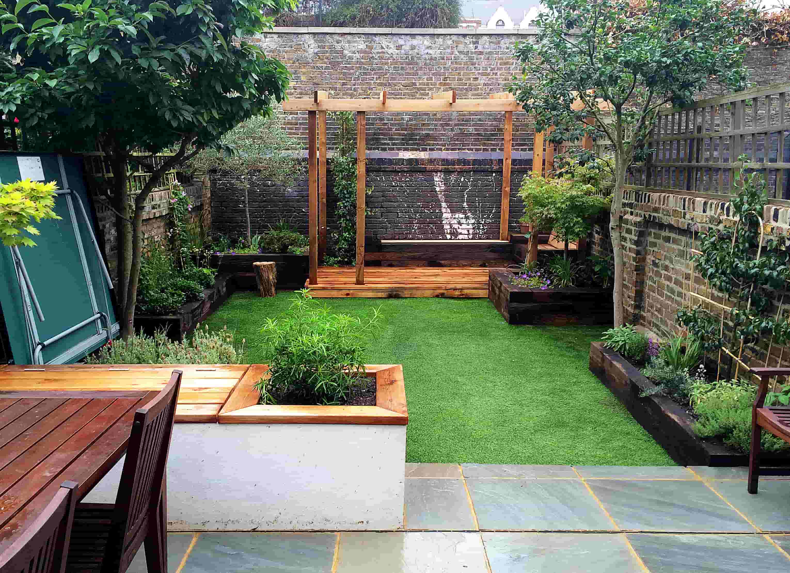 Small urban garden with fake lawns, a wooden pergola, raised plant beds, a patio dining area, and trees all bordered by classic brick walls.