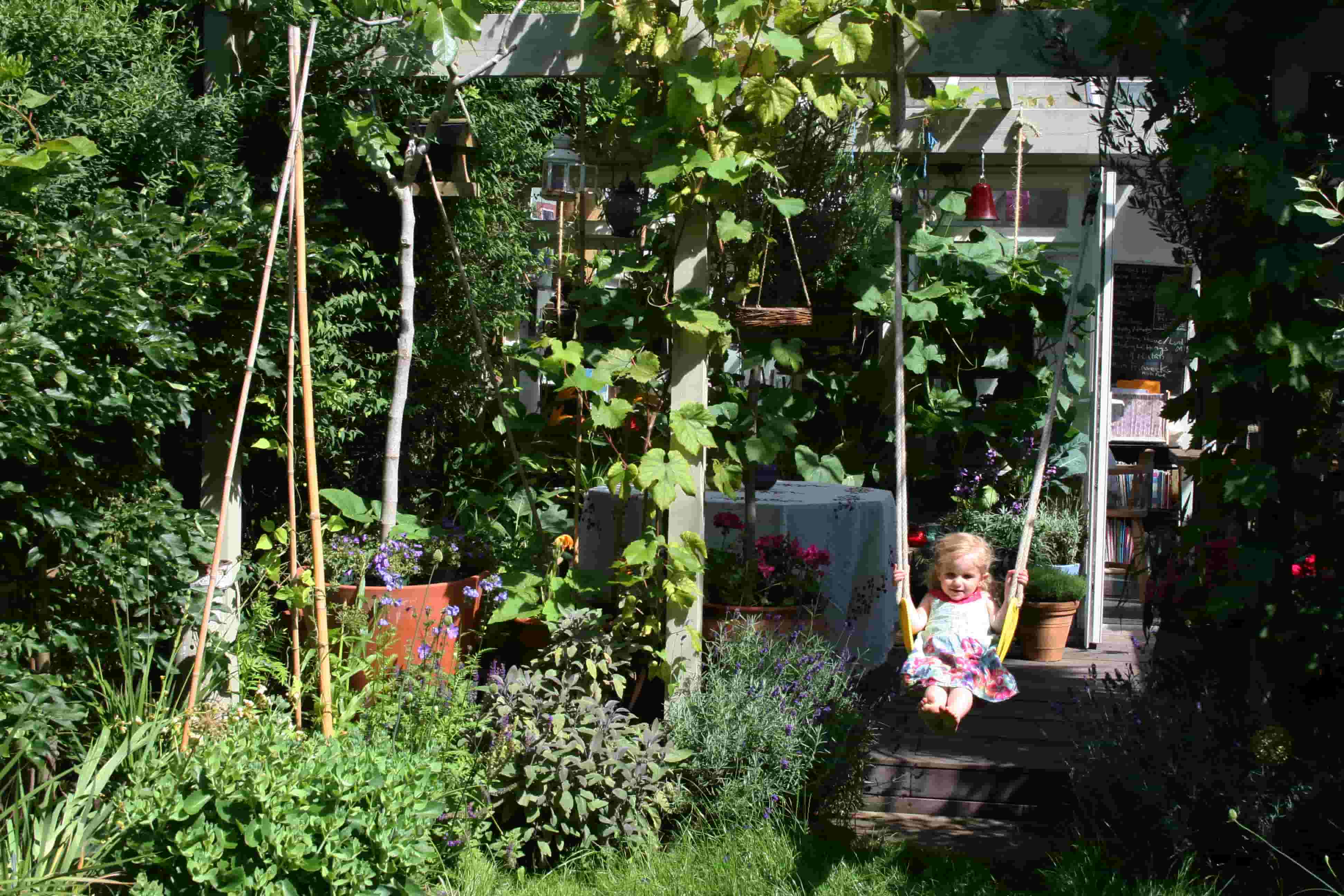 A young child in a colorful dress sits on a swing in lush gardens, surrounded by vibrant plants and blooming flowers.