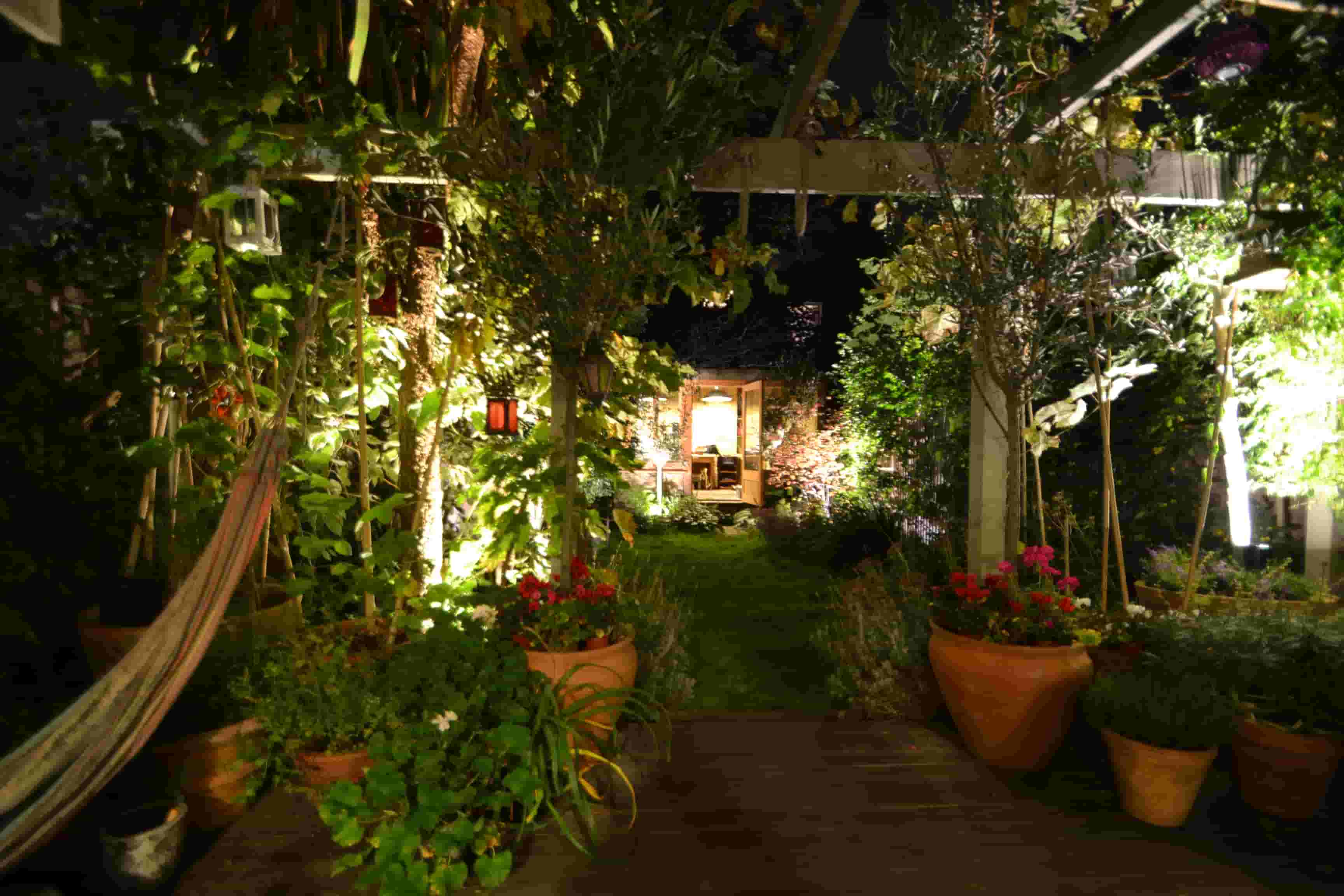 A well-lit garden at night with outdoor lighting highlighting potted plants, a hammock on the left, and a small illuminated structure at the far end.