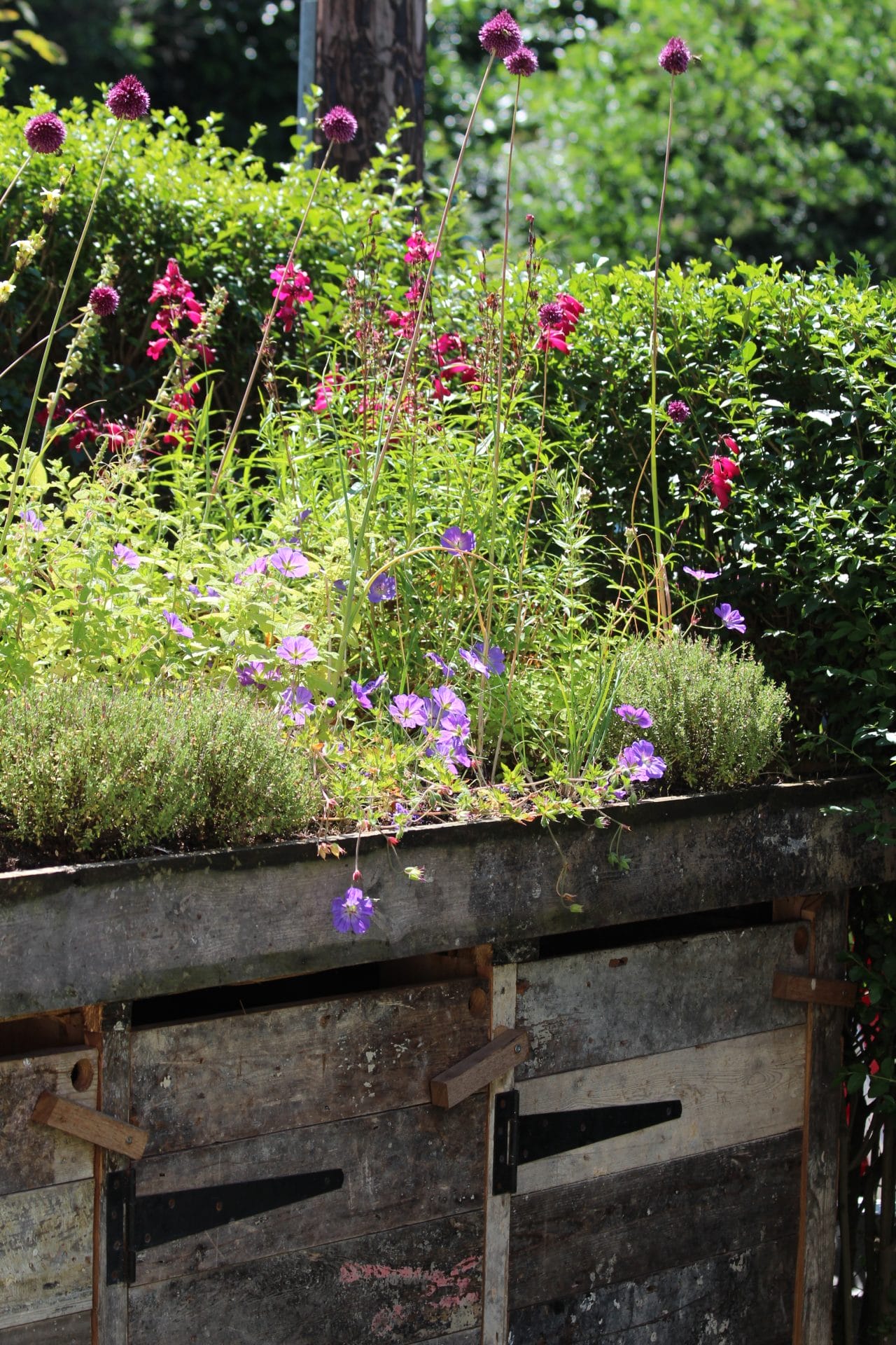 A variety of purple and pink flowers bloom in a front garden wooden planter, with green shrubbery and trees in the background on a sunny day.