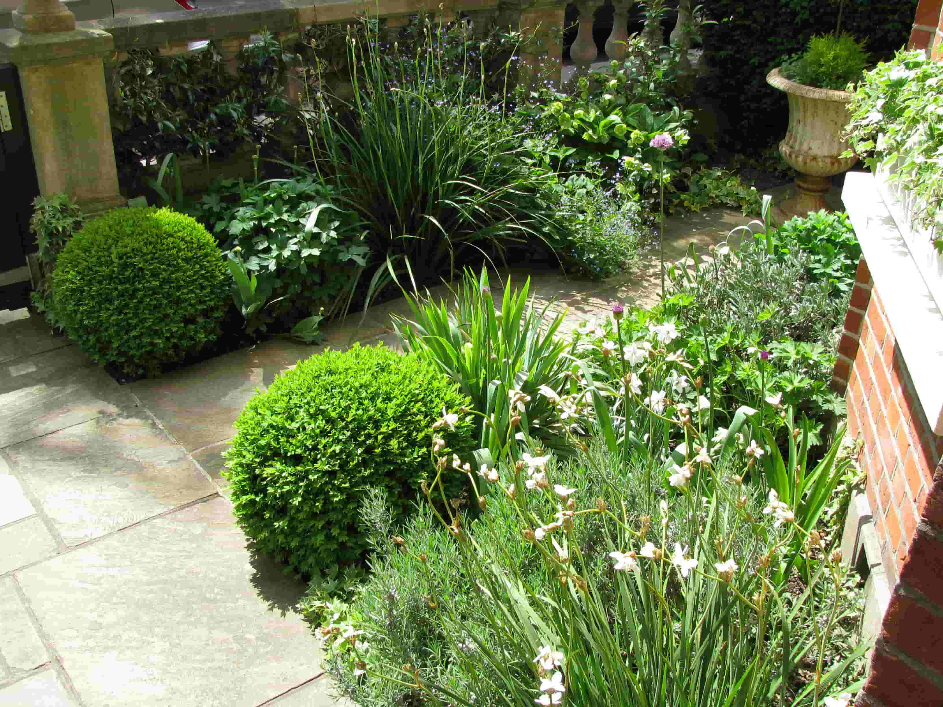A formal layout and cottage planting with a sense of history. The arrangement is symmetrical both in the hard landscaping and the placement of the box balls but is softened by the flowering perennials and bulbs. The ornamental urn at the end of the path can be planted seasonally and gives a nostalgic feel with its rustic exterior serving as a classical focal point, matching the material of the classic fence decorated with scented evergreen jasmines and variegated ivy. Other plants include oriental Hellebores, Libertias, Astrantias and forget-me-nots.
