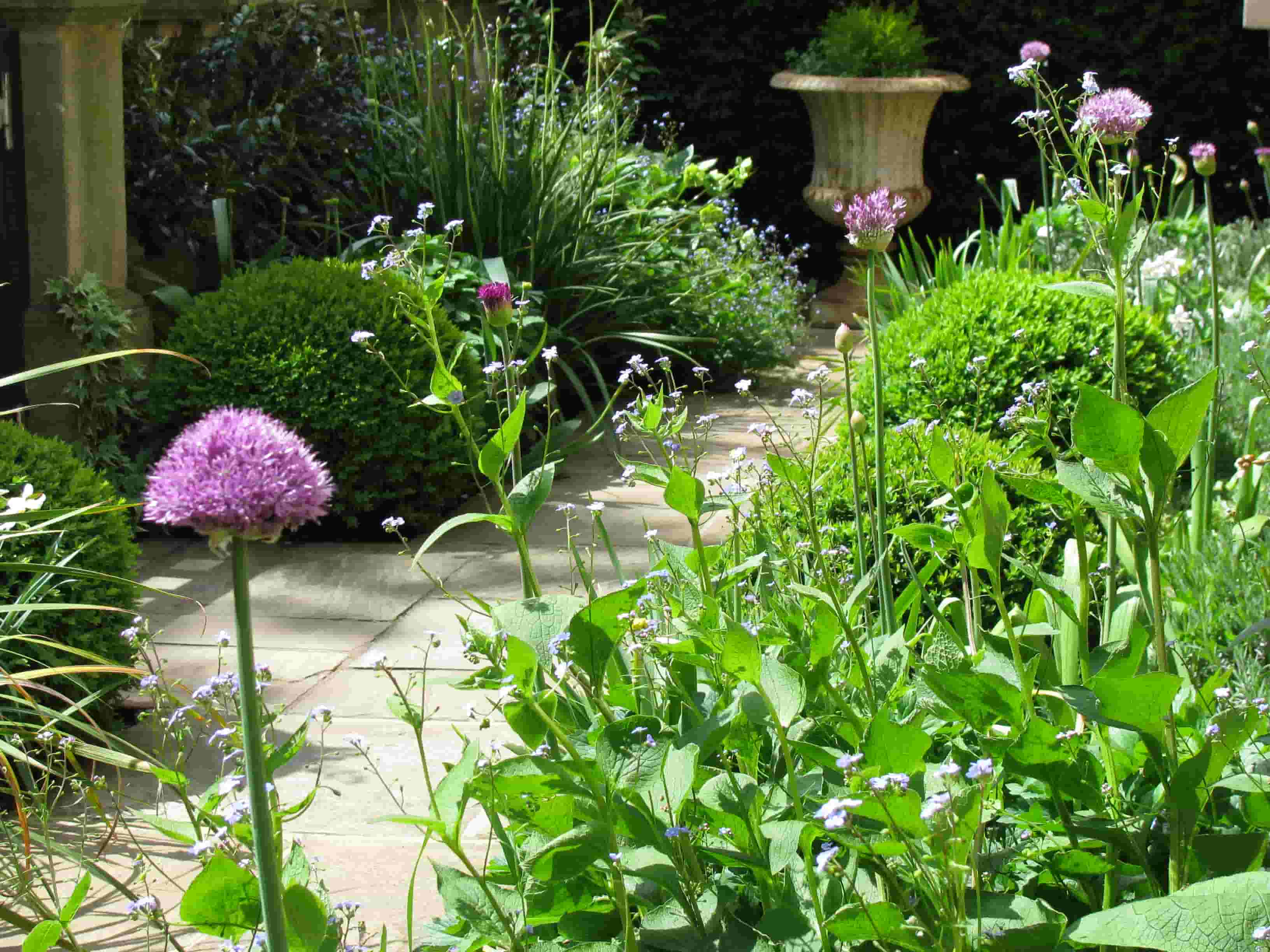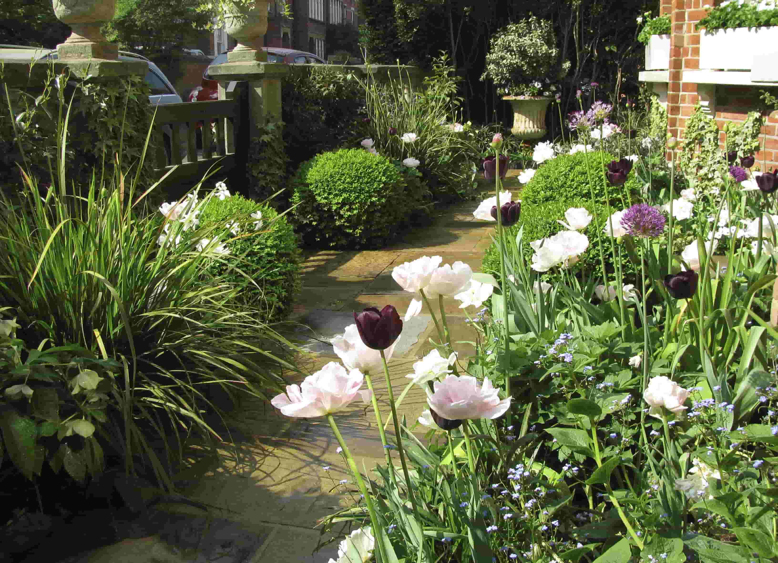 “The box balls stand next to the path as piers and an army of Alliums helps to mimic their shape with white and black tulips in early spring. When it comes to bulbs, mixing up three colours is usually enough.”