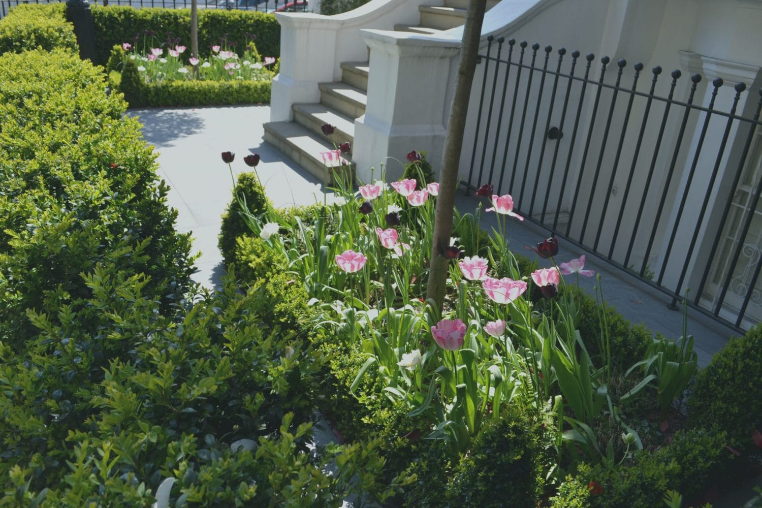 A small cottage garden with pink and dark purple tulips is bordered by neatly trimmed hedges in front of a building with stairs and a black metal fence.