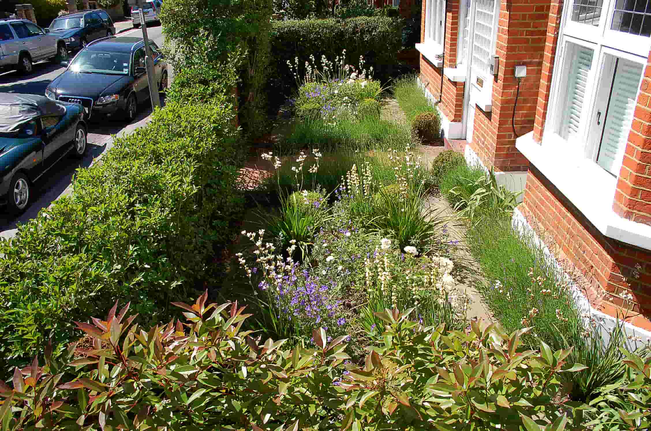 Front garden of a brick house with vibrant green plants and flowers, bordered by a neat hedge, with parked cars lining the street.