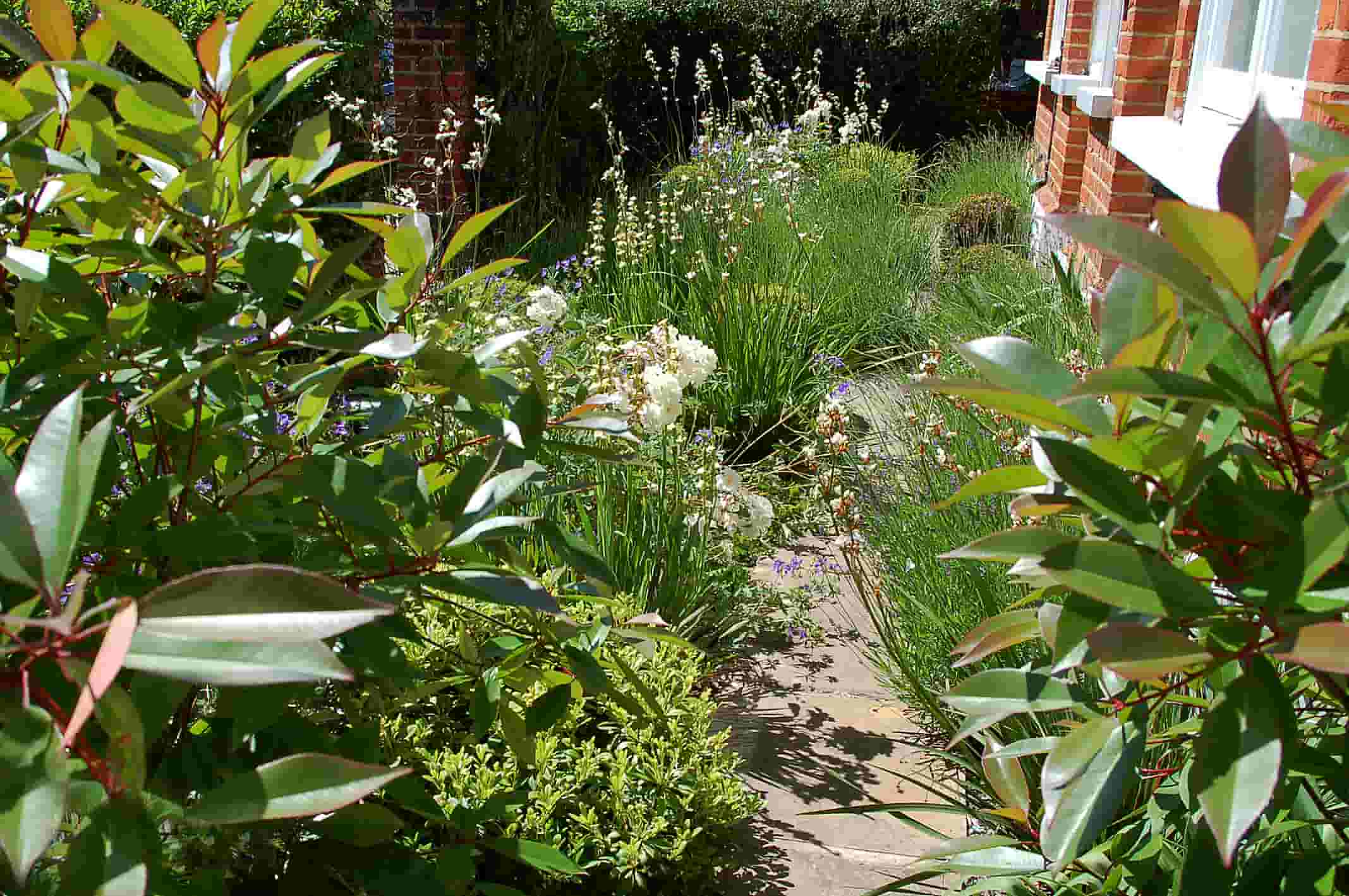 A narrow front garden path bordered by dense green foliage and flowering plants runs beside a brick house in bright sunlight.