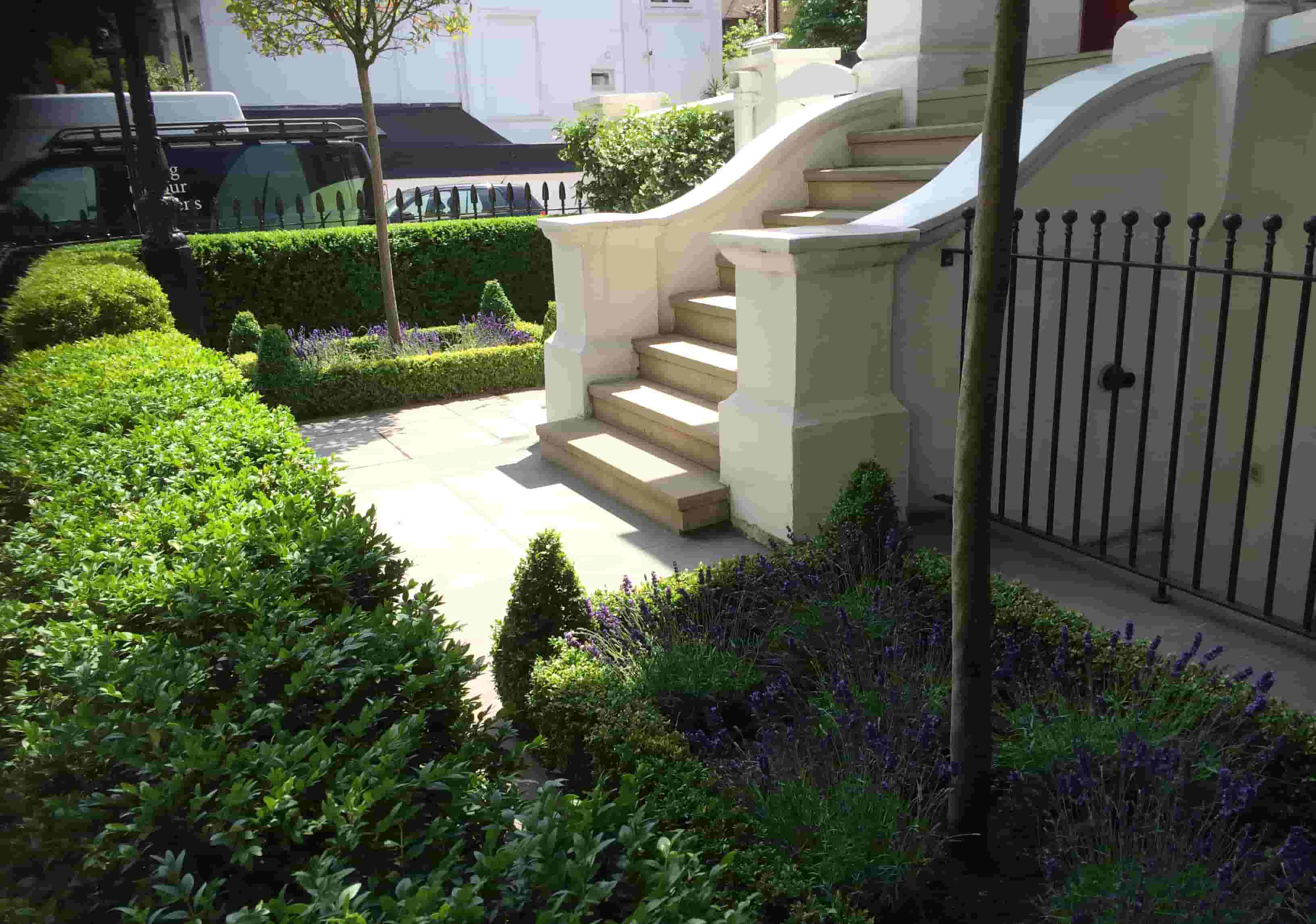 Front garden with neatly trimmed hedges, lavender plants, a paved walkway, and white steps leading to a gated entrance, evoking the elegance of an Italianate Garden.
