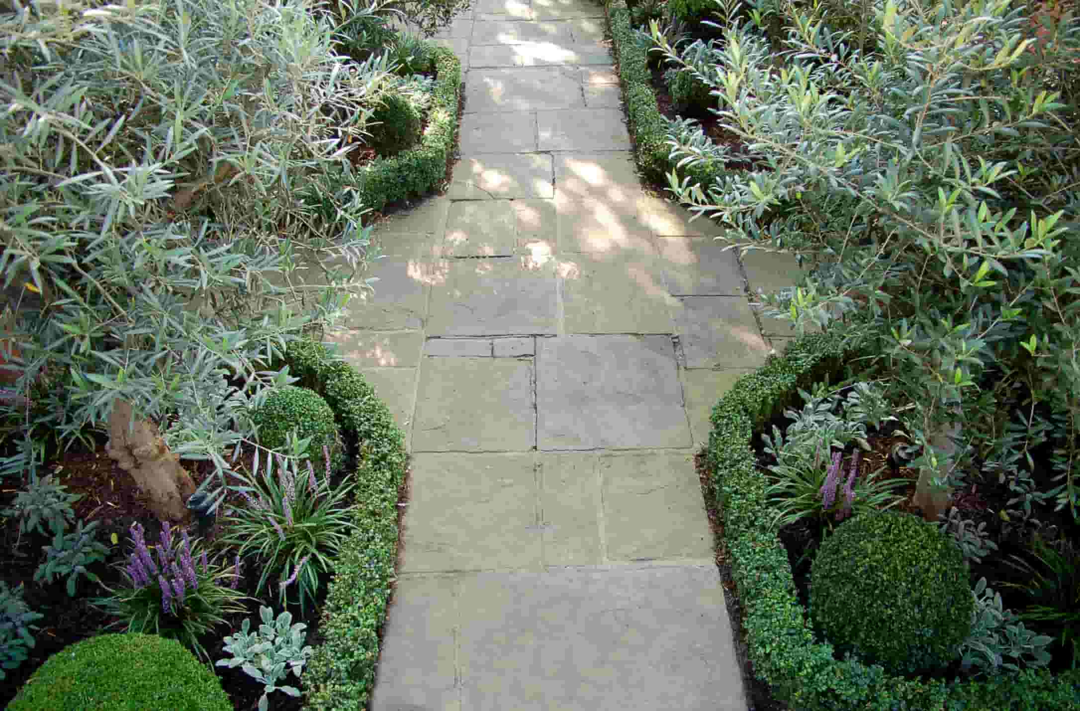 Stone pathway bordered by manicured boxwood hedges, olives, shrubs, and trees in a neatly landscaped garden.