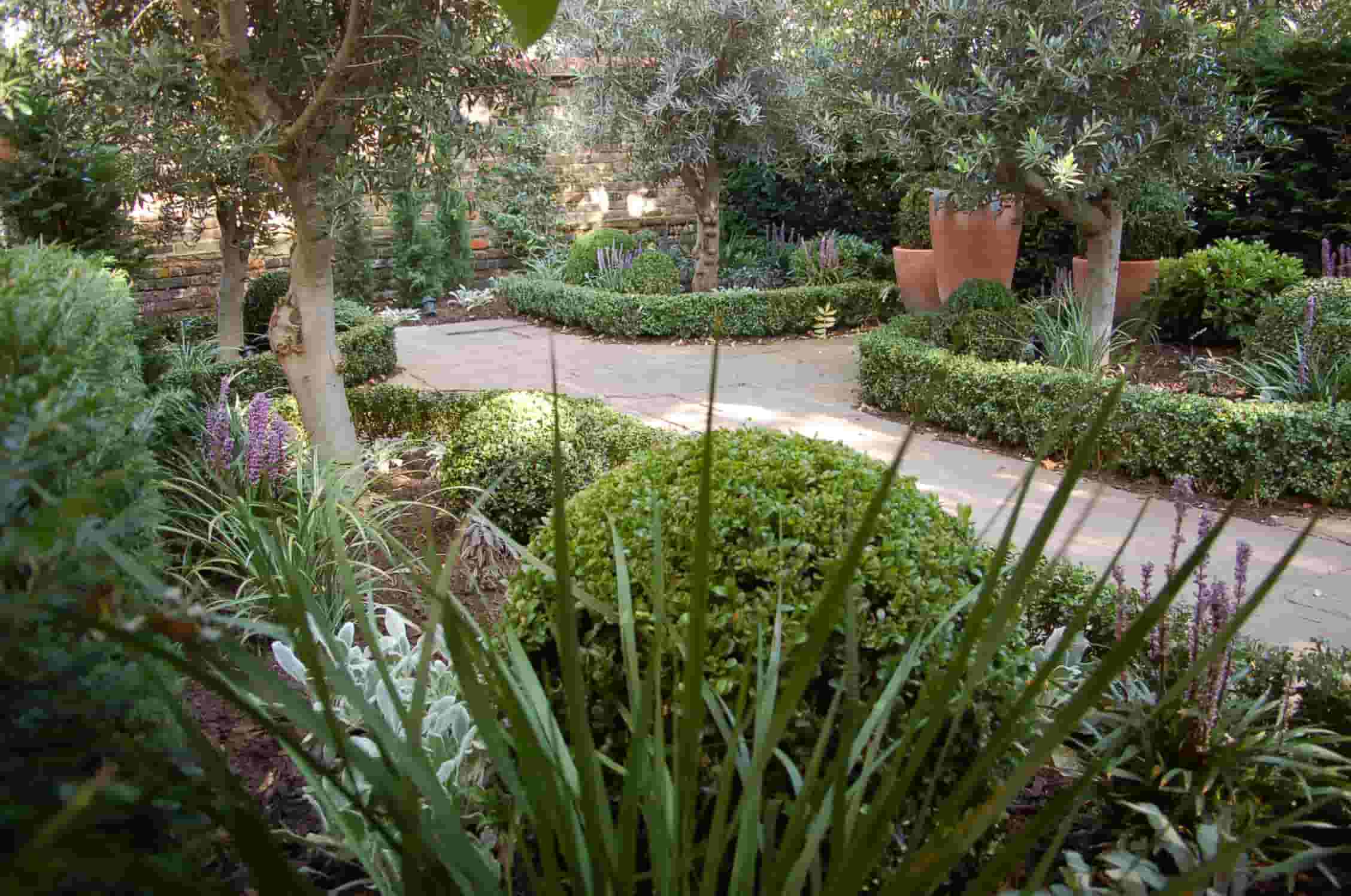 A landscaped garden with trimmed box hedges, various shrubs, potted olives, and a stone pathway winding through the greenery.