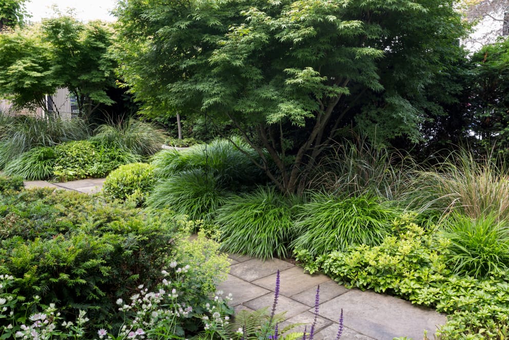 A front garden with stone pathways winding through dense green foliage, shrubs, and ornamental grasses beneath leafy trees.
