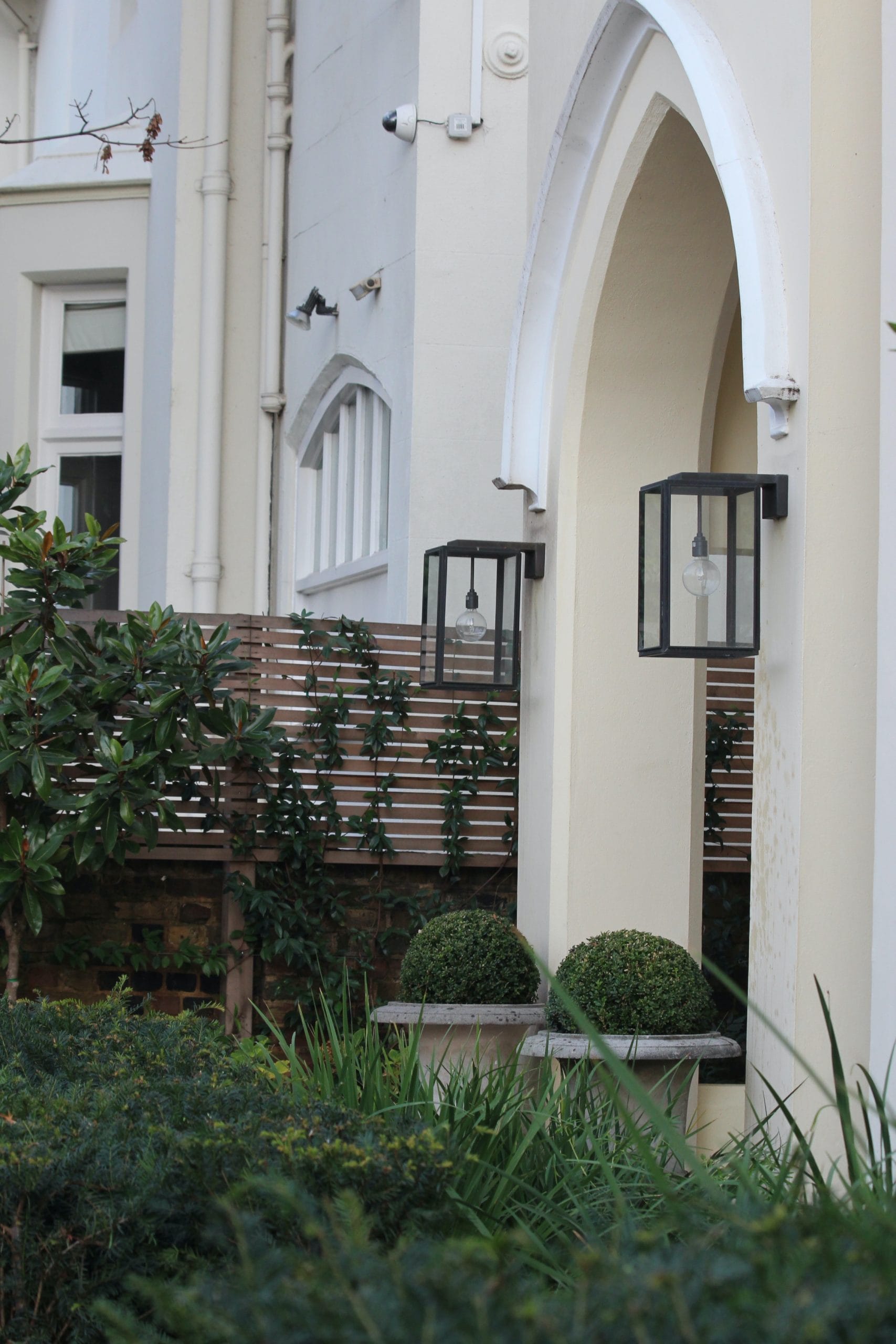 Cream-colored building exterior with arched doorway, modern black lantern, potted spherical shrubs, wooden fence, and lush front garden foliage in the foreground.