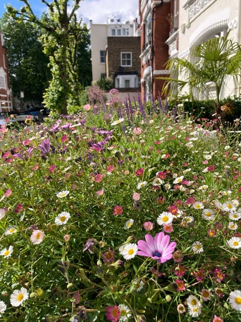 A front garden bursts with pink and white daisies and vibrant purple blooms, set against a row of residential buildings on a sunny day.