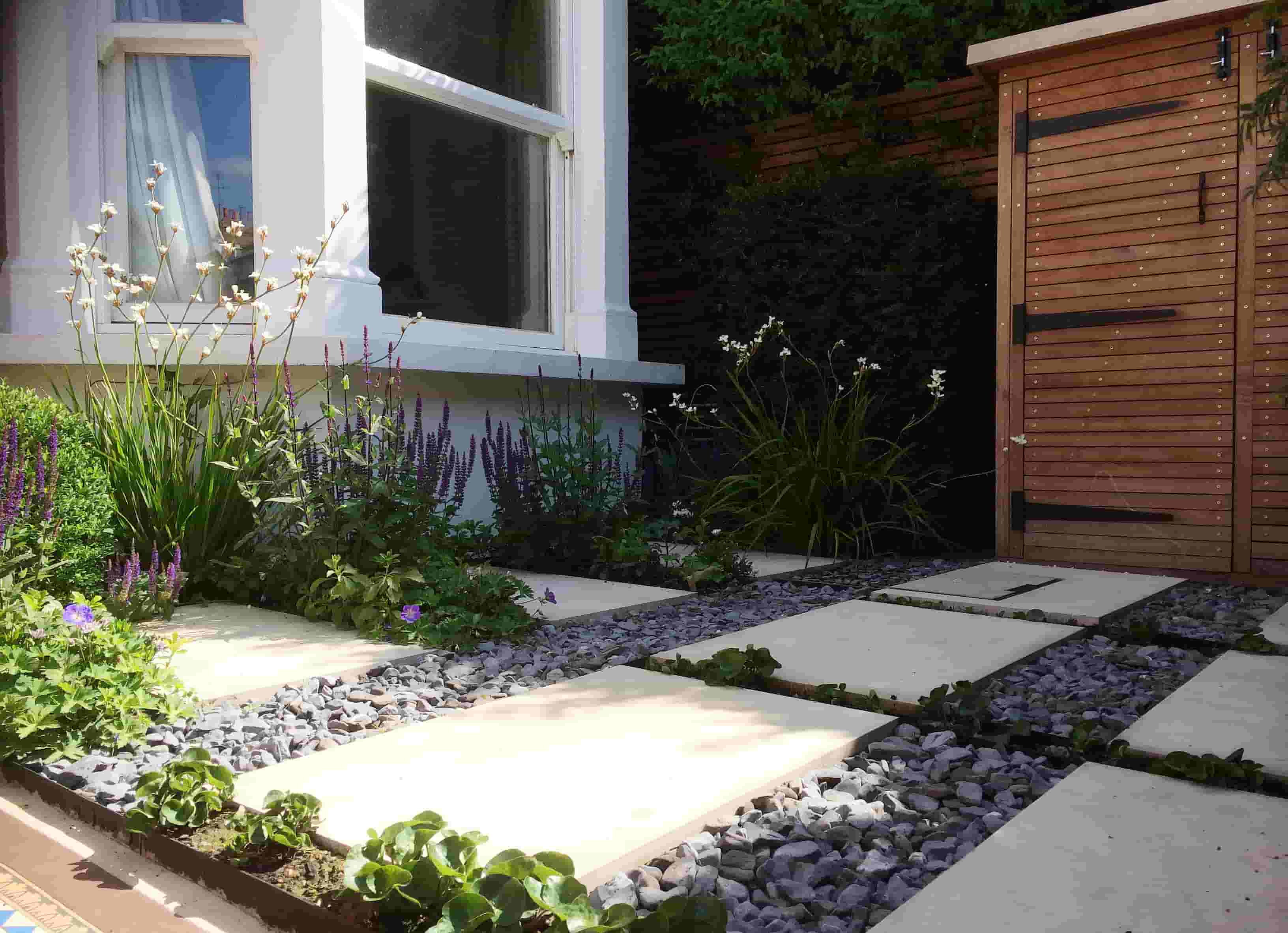 Small garden with stone textures on slabs and gray gravel paths, bordered by flowering plants and greenery, next to a wooden shed and a white house window.