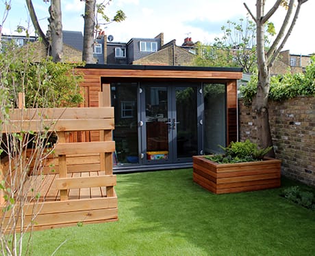 A modern wooden garden office with large glass doors sits in a small backyard with artificial grass, wooden planters, and a brick wall.
