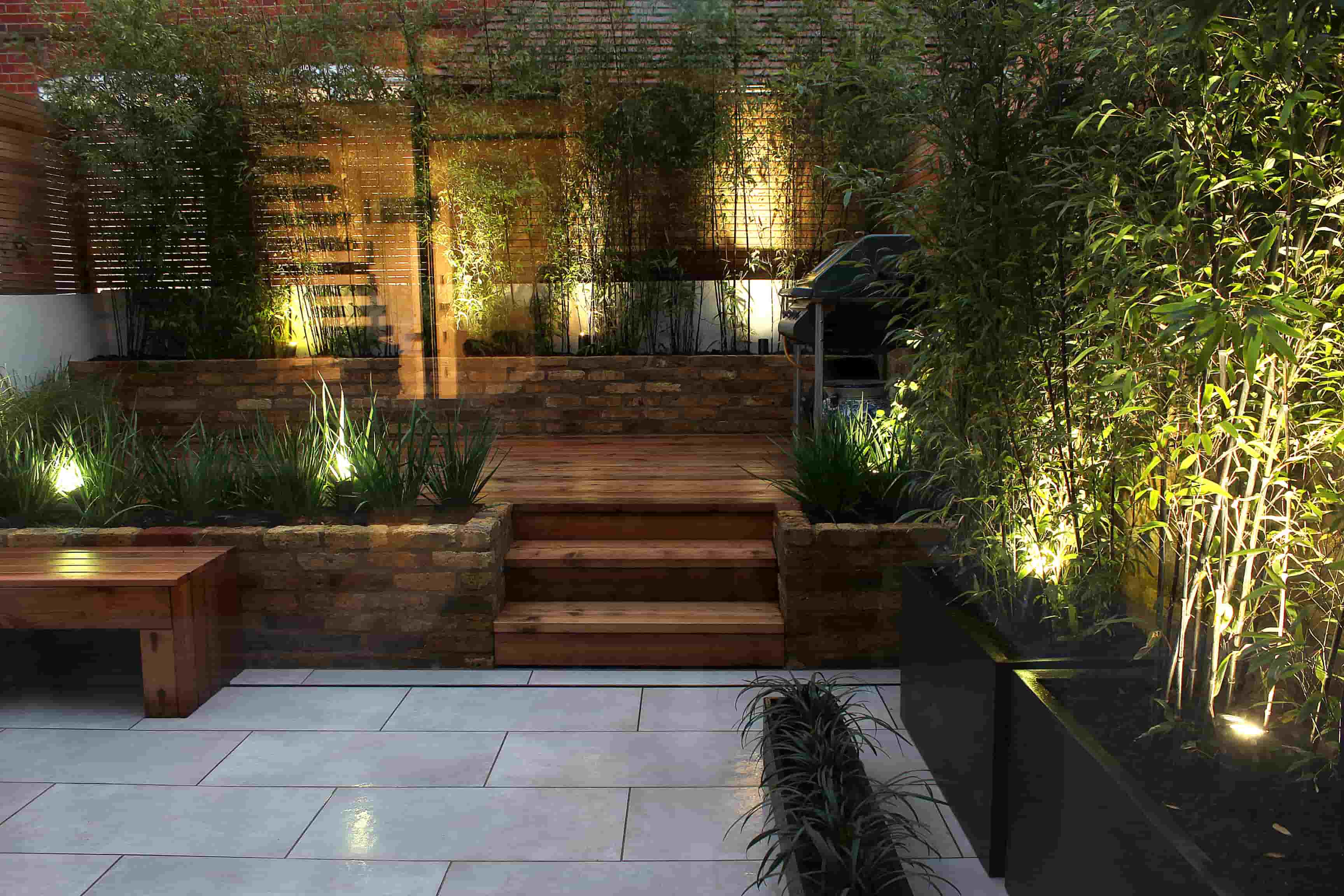 Modern backyard garden with wooden steps, brick walls, planters, and bamboo plants illuminated by ground lights in the evening, showcasing stylish building elements.