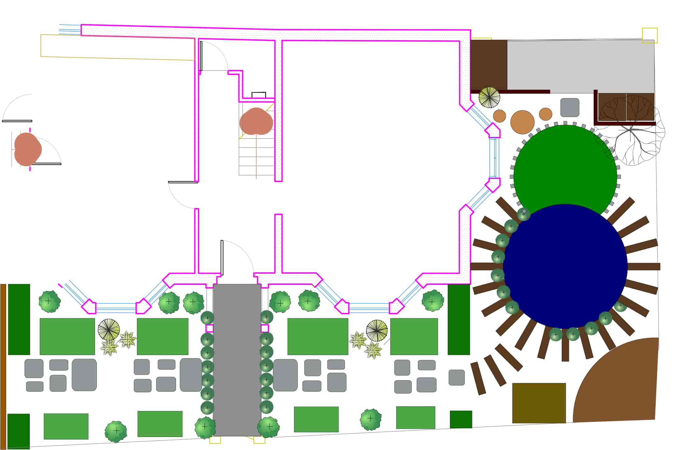 Friendly architectural site plan featuring a building layout, lush greenery, inviting pathways, cozy seating areas, circular features, and rectangular planting zones.
