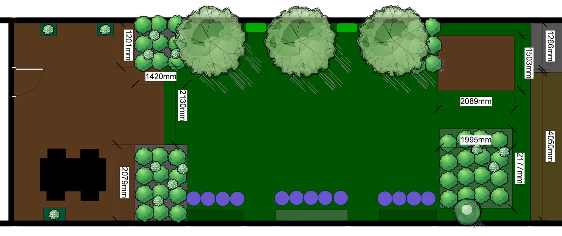Modern family landscape plan showing a rectangular garden with trees, shrubs, paved areas, measurements in millimeters, and a mix of green and brown zones.