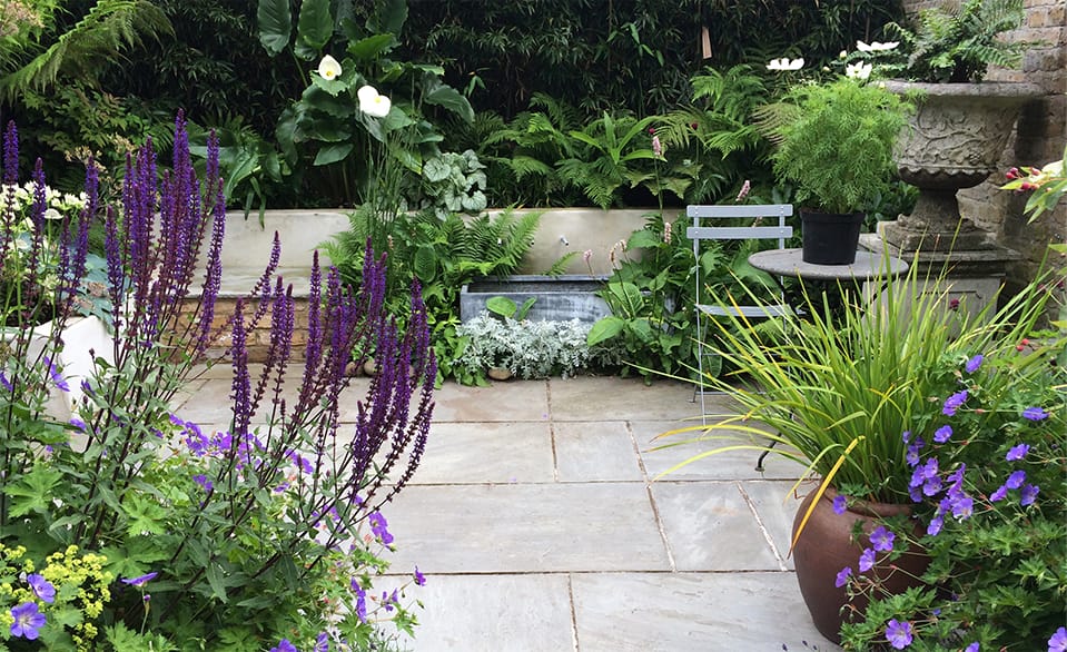 A sketch of a small patio garden with stone paving, purple and white flowers, green plants, a metal chair, a round table, and a stone birdbath set against a charming brick wall.