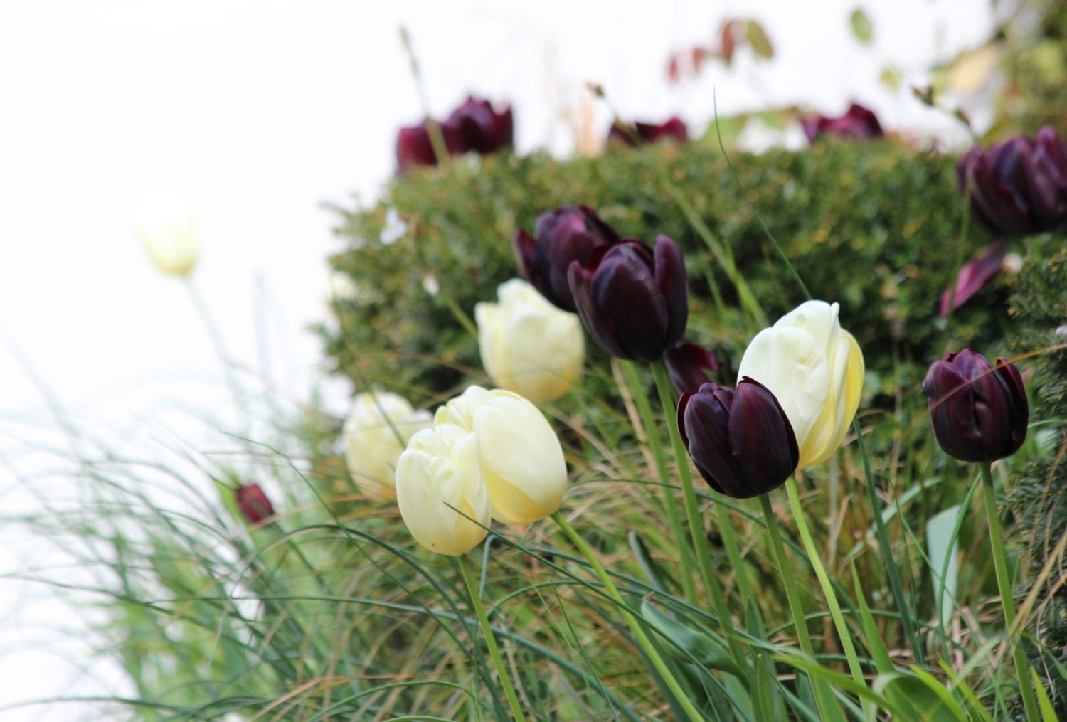 Yellow and dark purple tulips, the result of careful bulb planting, grow among green grass and foliage, with a bright, blurred background.