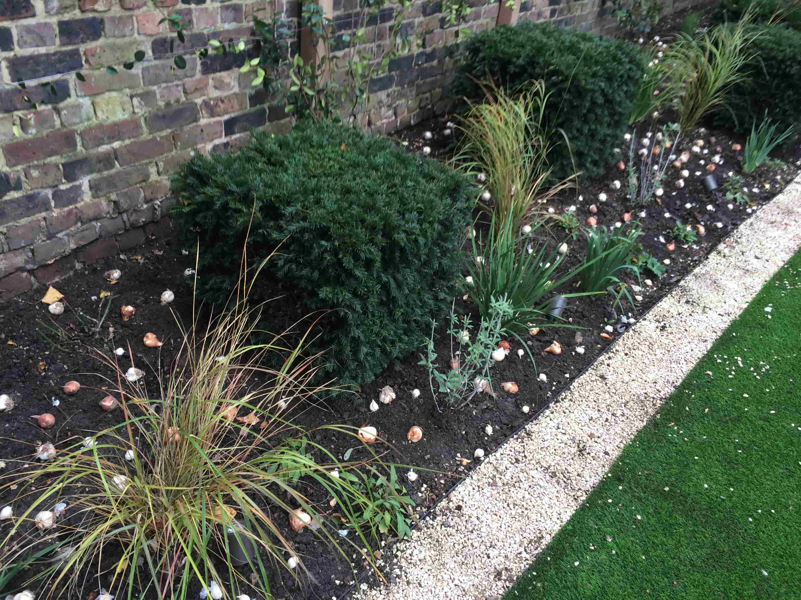 A garden border with small shrubs, ornamental grasses, and scattered seashells, featuring areas for bulb planting beside a gravel path and artificial grass, all set against a brick wall.
