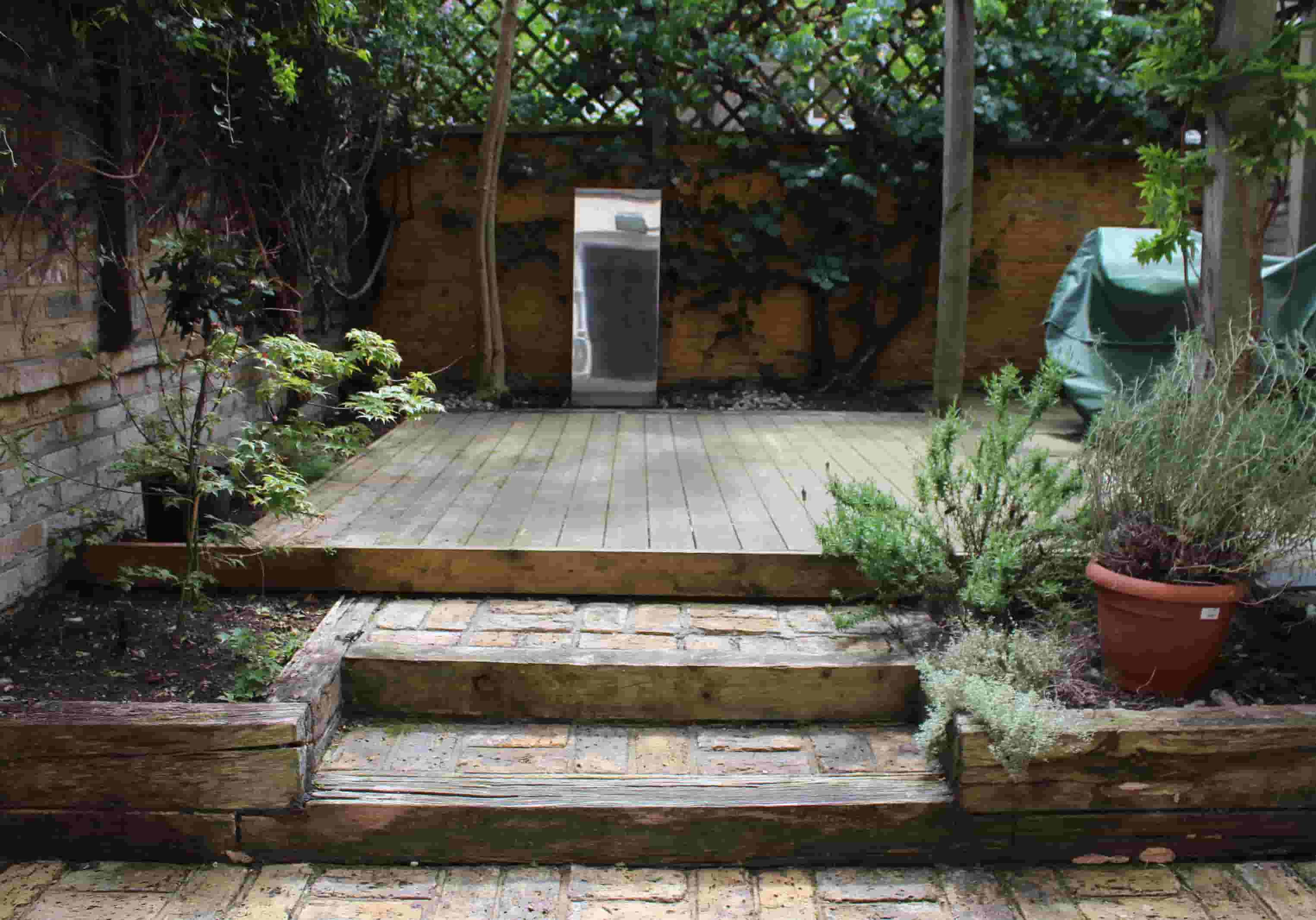 A small, garden rejuvenating space with stone steps leading to a wooden deck, potted plants, lush greenery, and a covered item on the right. A rectangular mirror stands against the back wall.