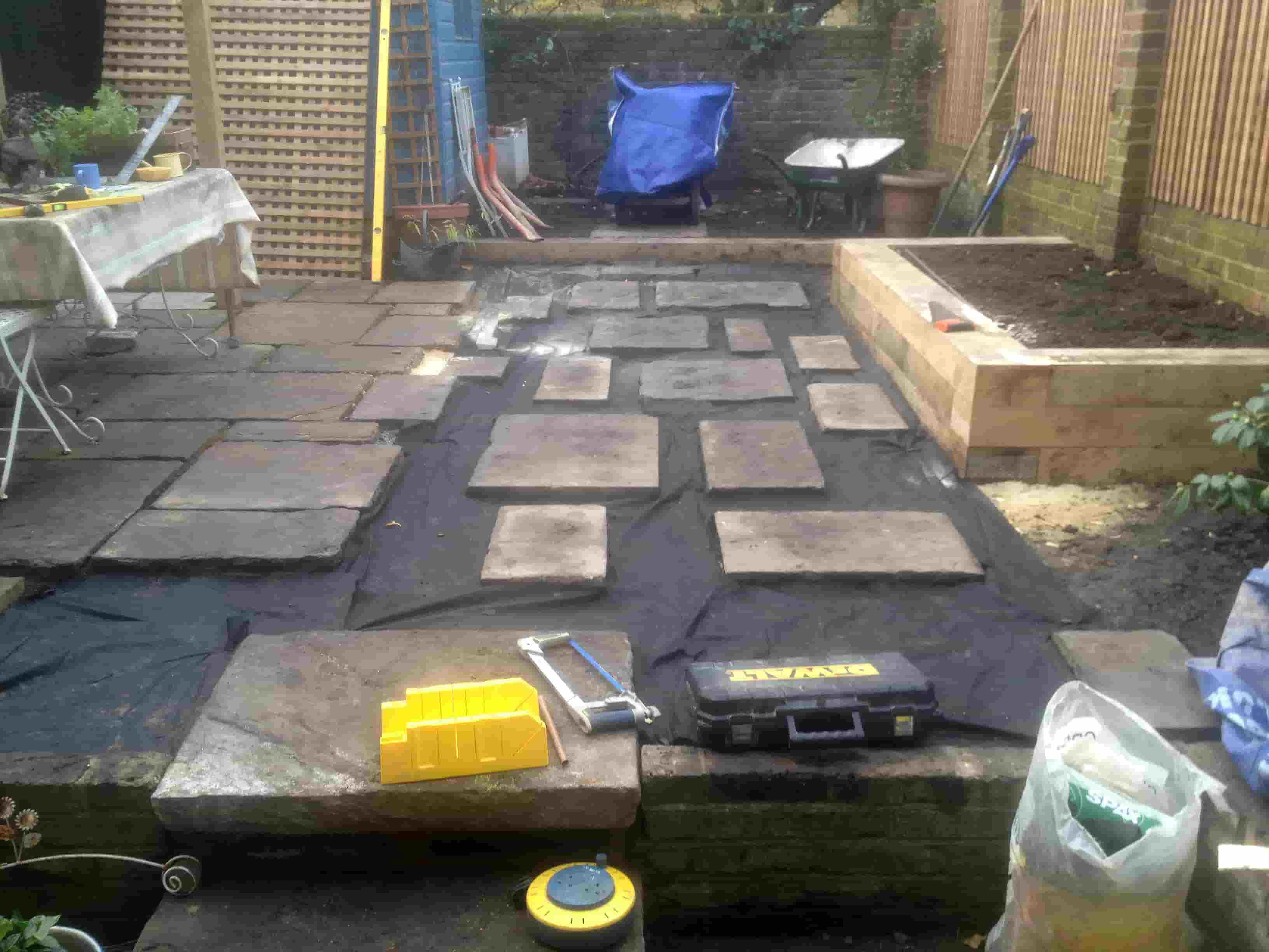Garden patio under construction in Brook Green, with stone slabs being arranged on a black membrane, surrounded by tools, a raised bed, and garden equipment.