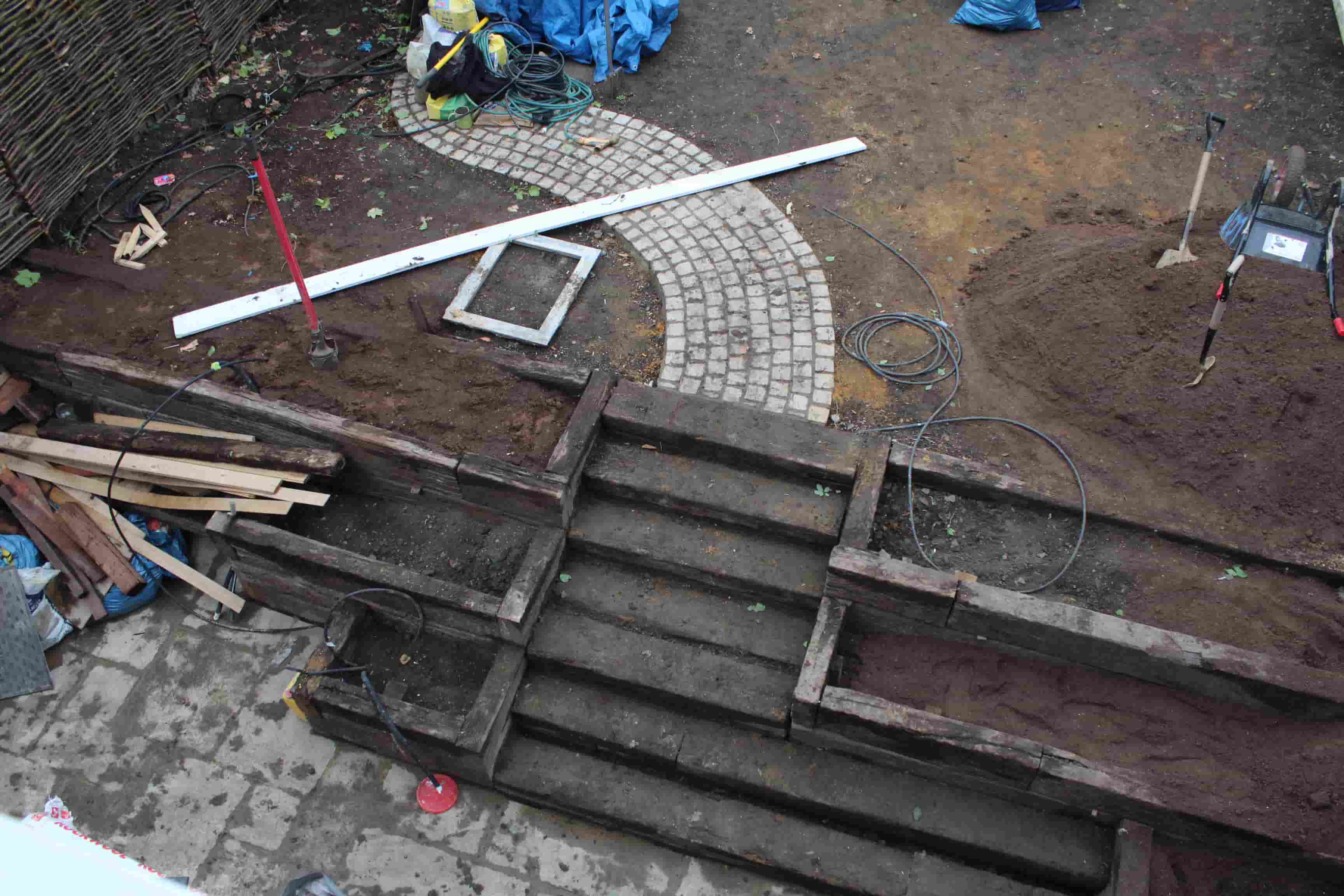 Outdoor garden construction in Queens Park featuring stone steps, a curved stone pathway, soil piles, scattered tools, wooden planks, wiring, and a small raised planting bed.