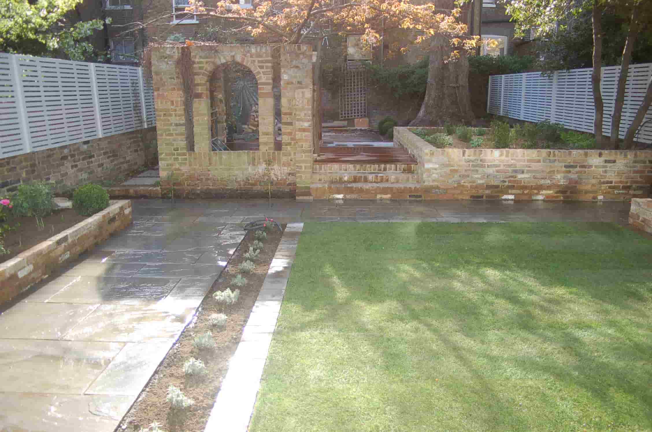 A landscaped Hammersmith backyard features a grass lawn, stone pathway, raised brick planters, and a brick archway with a tree in the background.