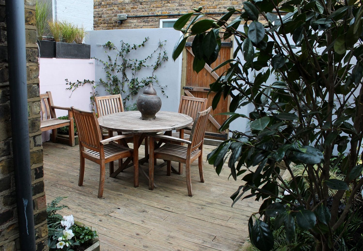 Wooden patio furniture set with a round table and four chairs sits on a wooden deck. A large ceramic vase is on the table, surrounded by lush planting design and a wooden fence.